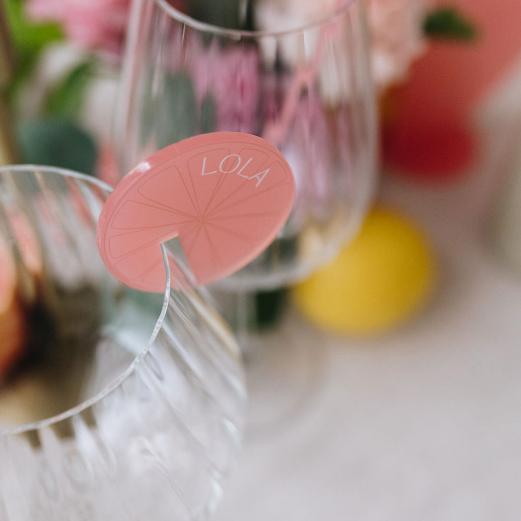 Découvrez les marque-verres Dolce en plexi givré colorés. Imaginés par les Mignonneries, ils sont à personnaliser avec les prénoms de vos invités. Une façon originale et pratique pour décorer la table le jour J!