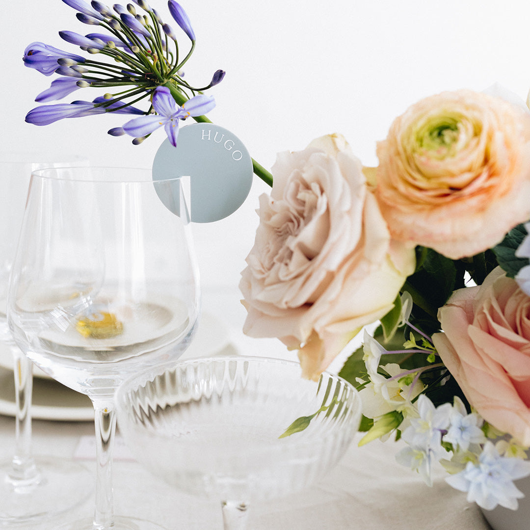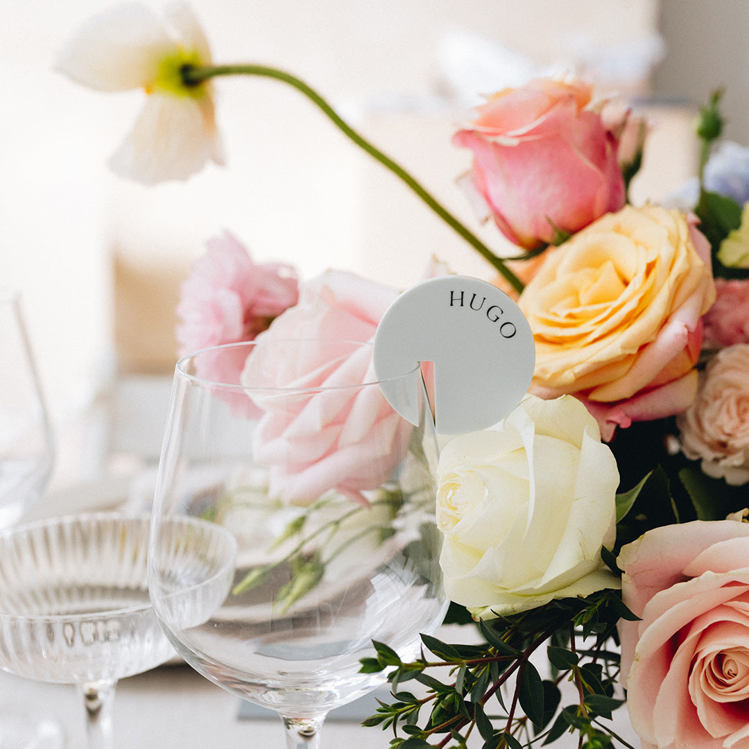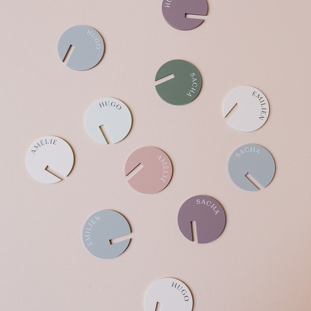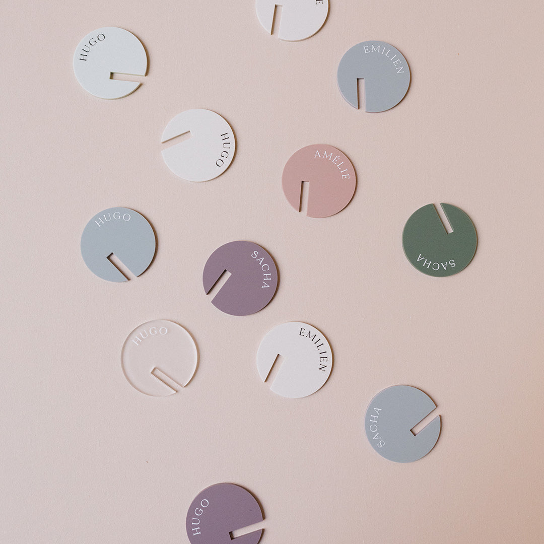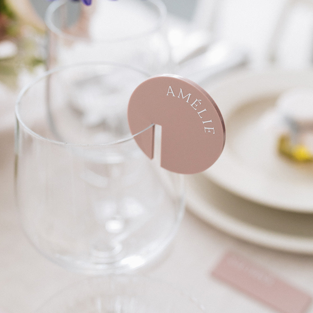 Découvrez les marque-verres Lola en plexi mat colorés. Imaginés par les Mignonneries, ils sont à personnaliser avec les prénoms de vos invités. Une façon originale et pratique pour décorer la table le jour J!