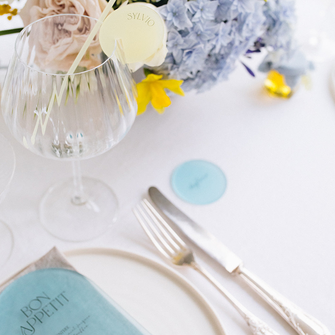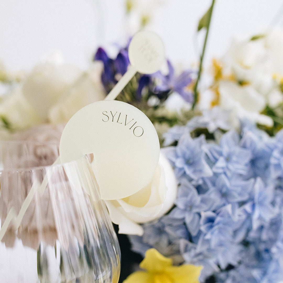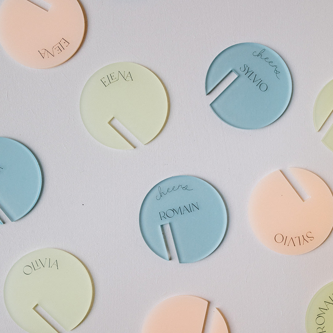 Découvrez les marque-verres Pastel en plexi givré colorés. Imaginés par les Mignonneries, ils sont à personnaliser avec les prénoms de vos invités. Une façon originale et pratique pour décorer la table le jour J!
