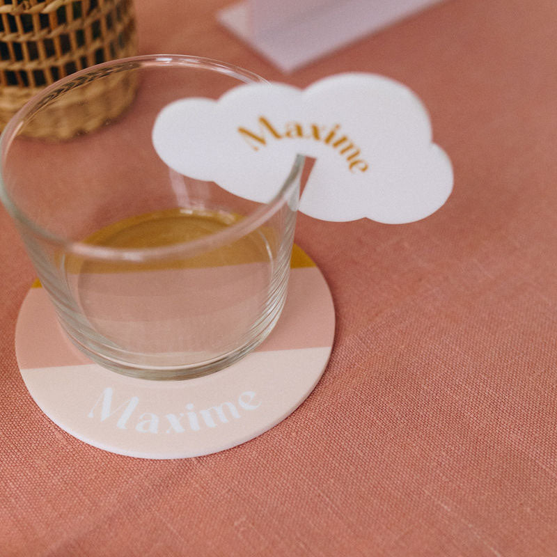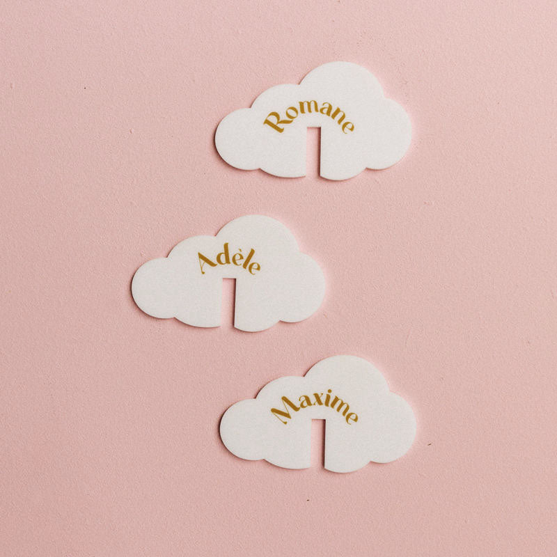 Découvrez les marque-verres en plexi imprimés nuage. Imaginés par Les Mignonneries et à personnaliser avec les prénoms de vos petits invités, ils sont fabriqués à partir de plexi mat. Ils sont coupés et imprimés dans notre atelier.