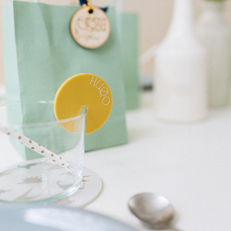 Découvrez les marque-verres en plexi imprimé Dino. Imaginés par Les Mignonneries et à personnaliser avec les prénoms de vos petits invités, ils sont fabriqués à partir de plexi mat. Ils sont coupés et imprimés dans notre atelier. Les marque-verres Dino sont disponibles en 4 couleurs au choix.