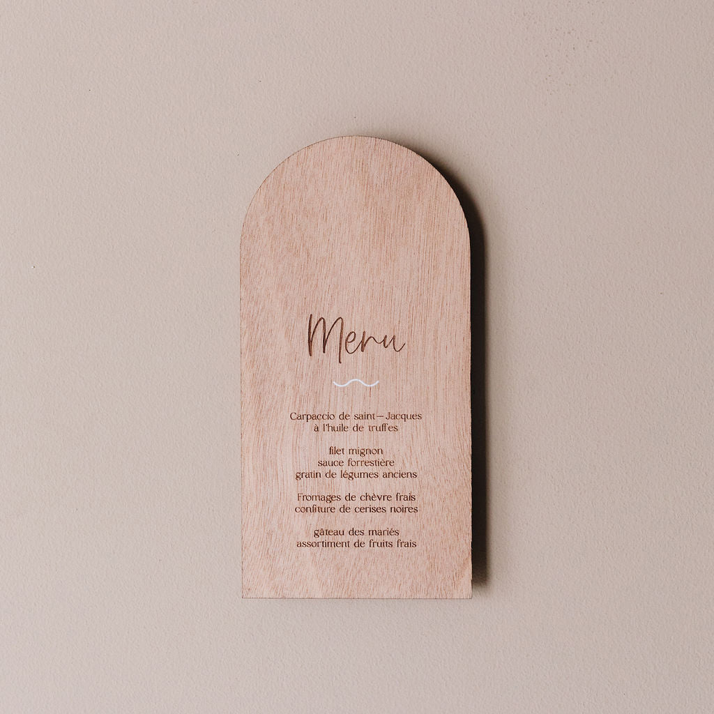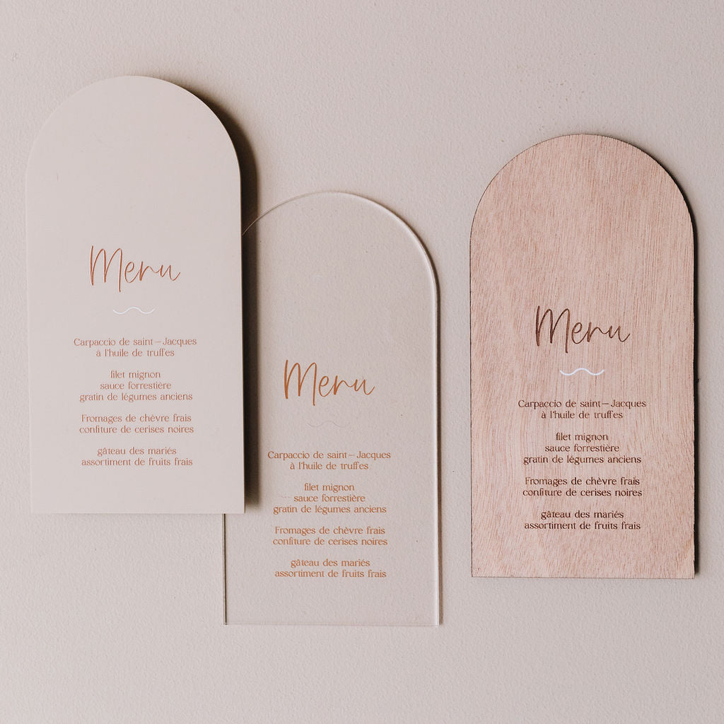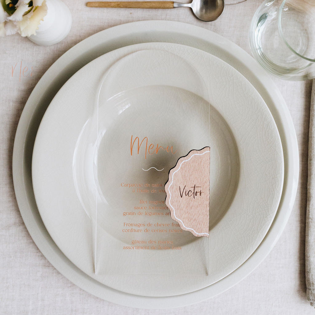 Découvrez les menus sur plexi nude, transparent ou bois. De jolis menus imprimés et imaginés par Les Mignonneries à personnaliser avec votre texte.