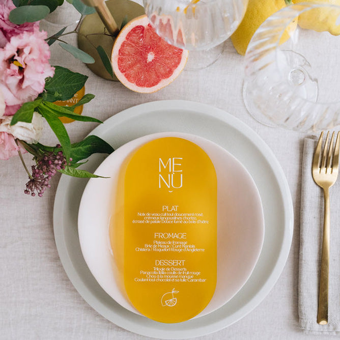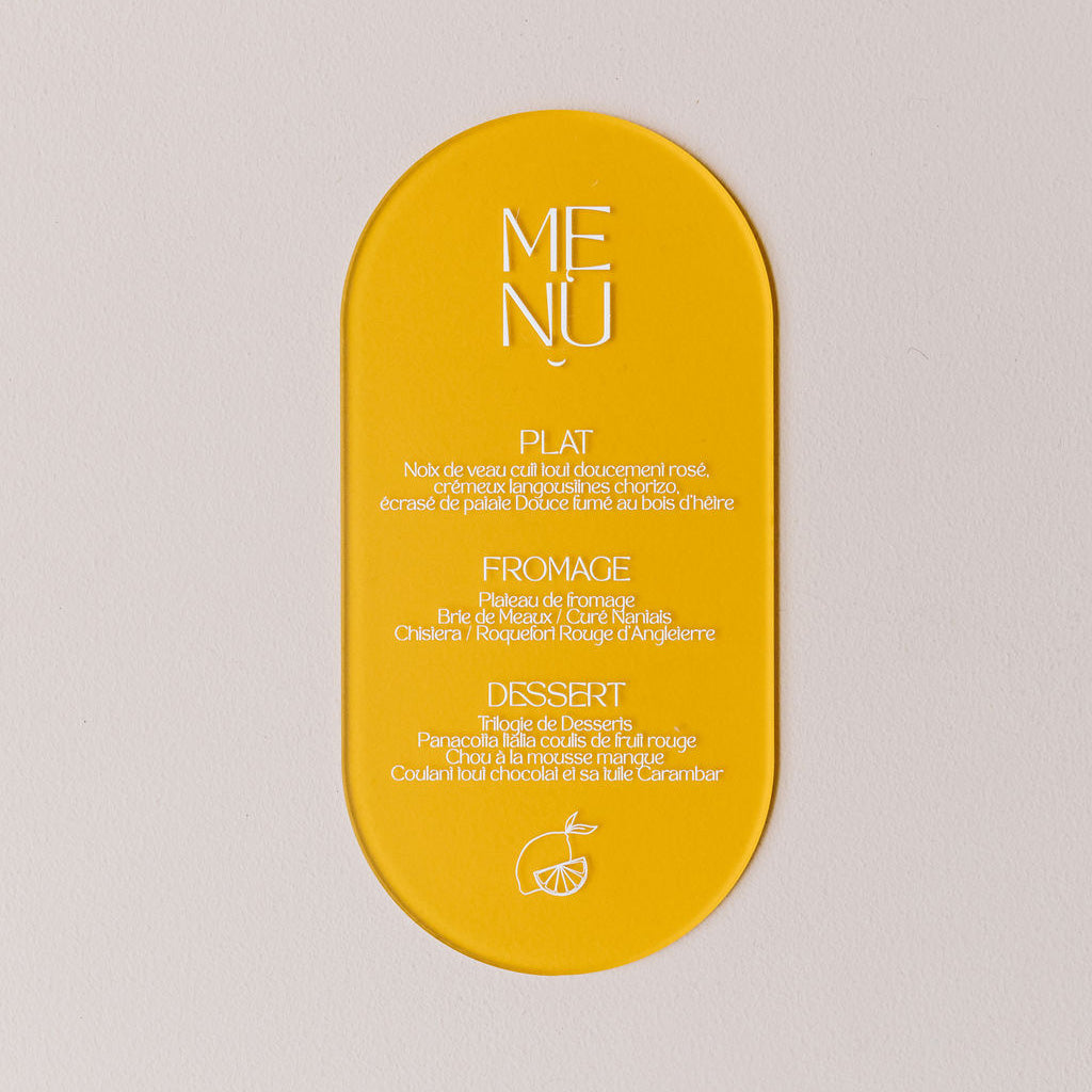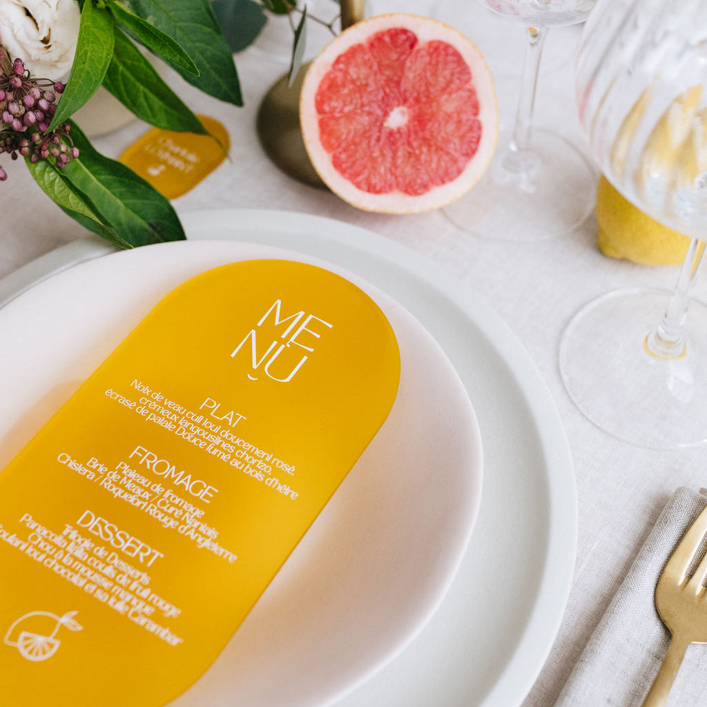 Découvrez les menus sur plexi givré coloré Dolce. De jolis menus découpés et imprimés dans notre atelier à personnaliser avec votre texte.