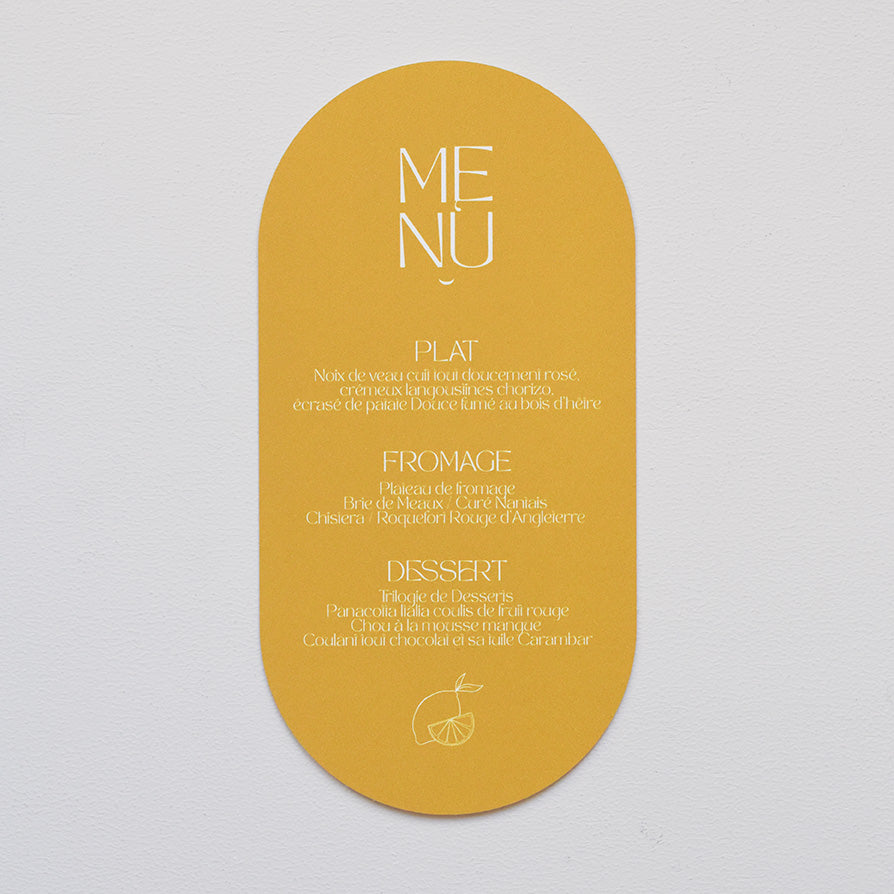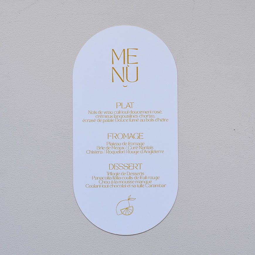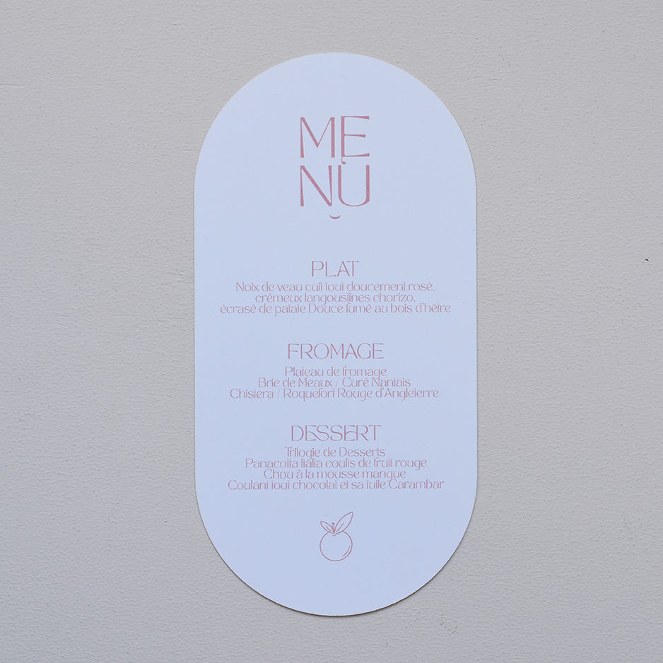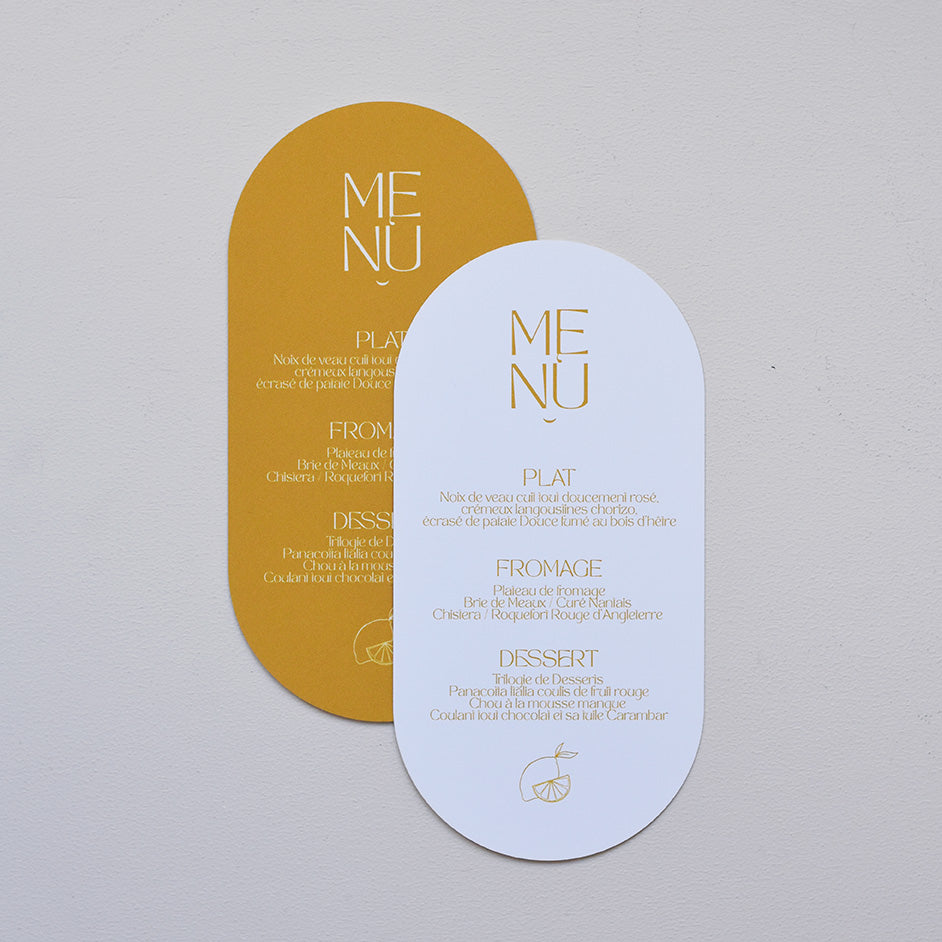 Découvrez les menus dolce en papier texturé 320g/m2 (couleur) ou papier banc lisse 320g/m2. De jolis menus imprimés et imaginés par Les Mignonneries à personnaliser avec votre texte.