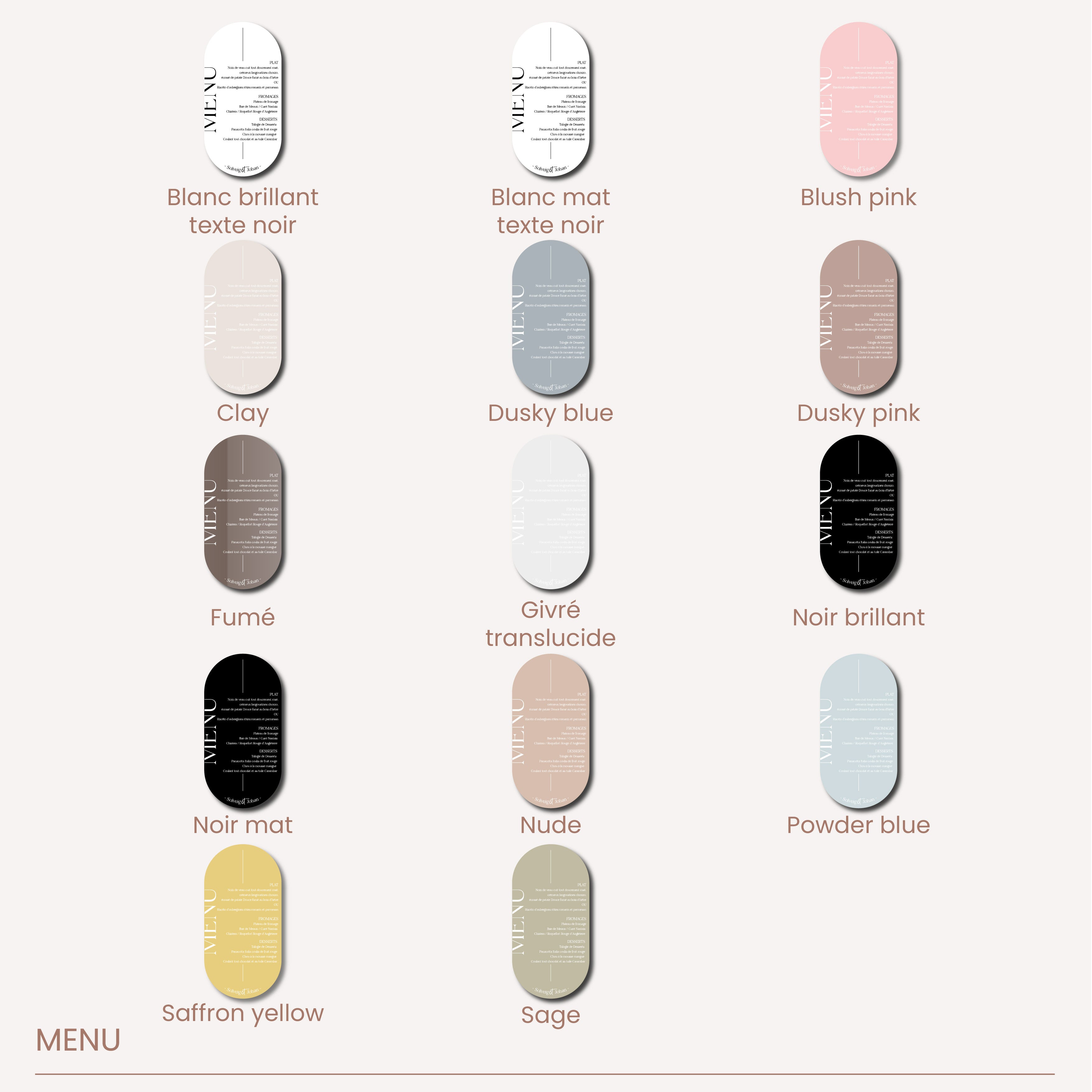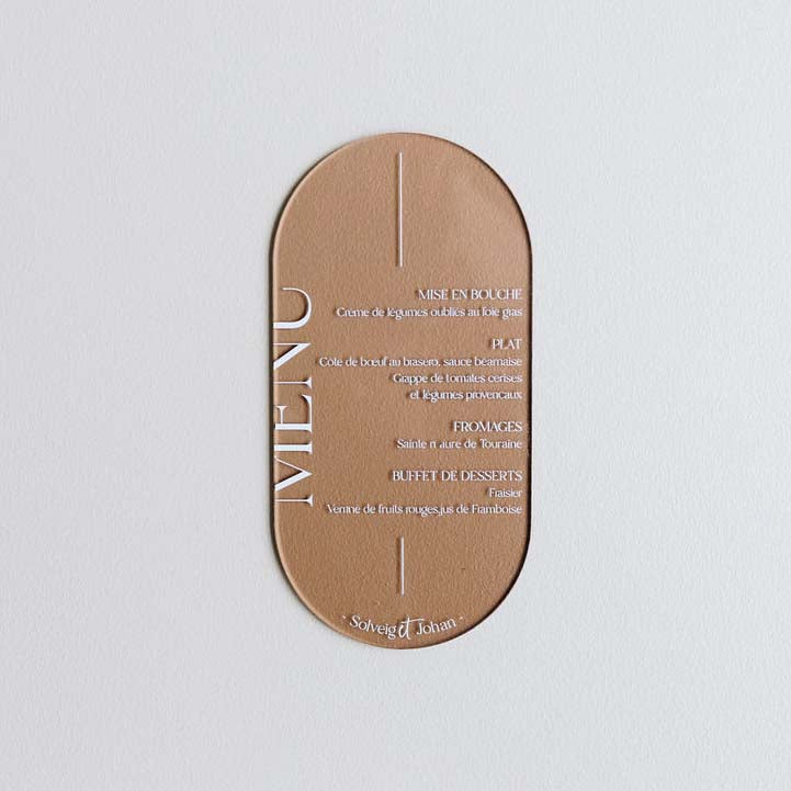 Les menus personnalisés Les Mignonneries permettront à vos invités de découvrir le repas le jour de votre évènement de manière élégante et raffinés. Une jolie touche à poser sur socle au centre de la table ou bien dans l’assiette de chaque invité.