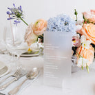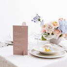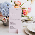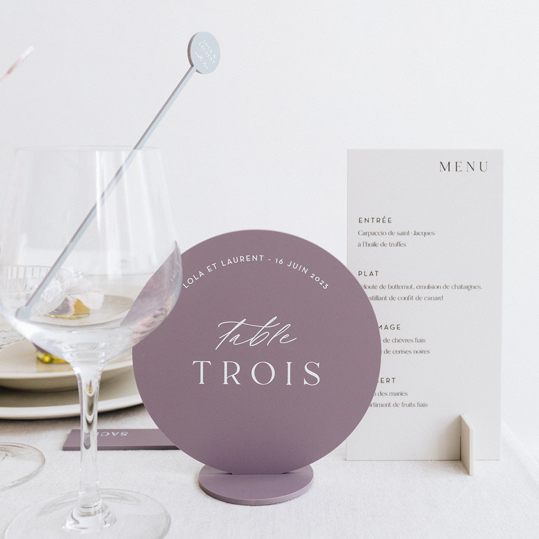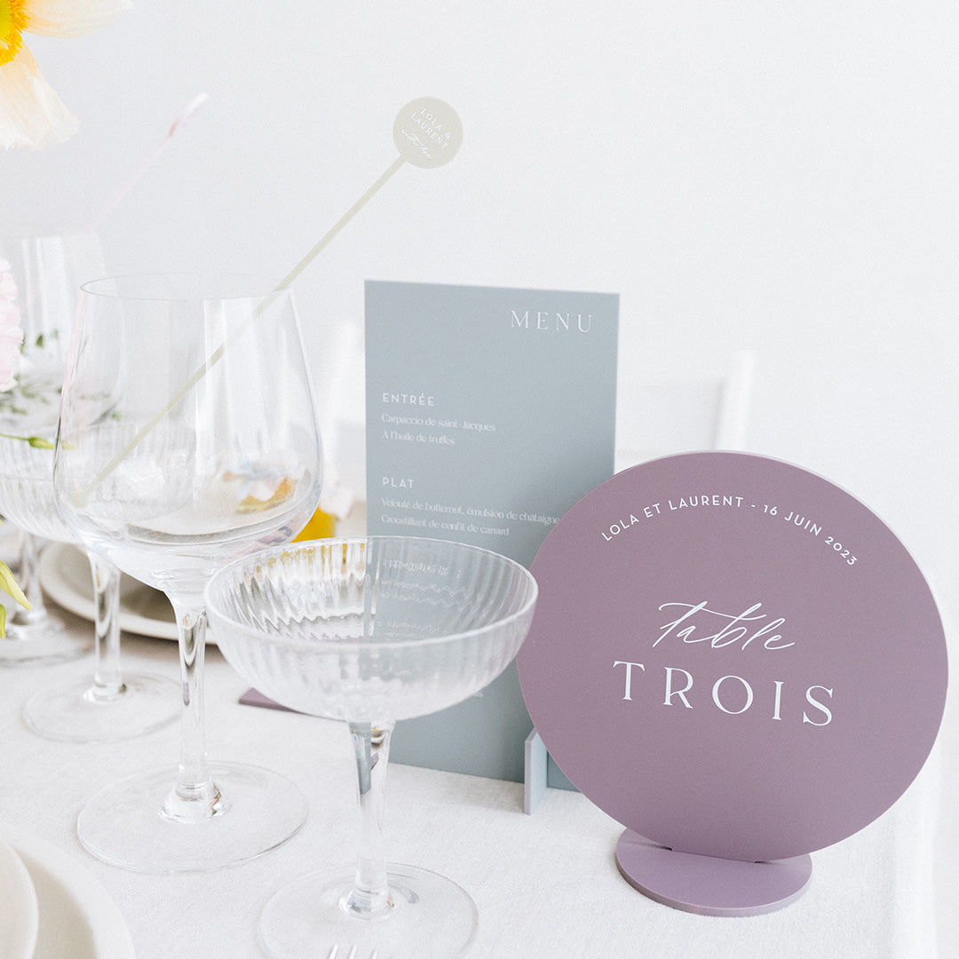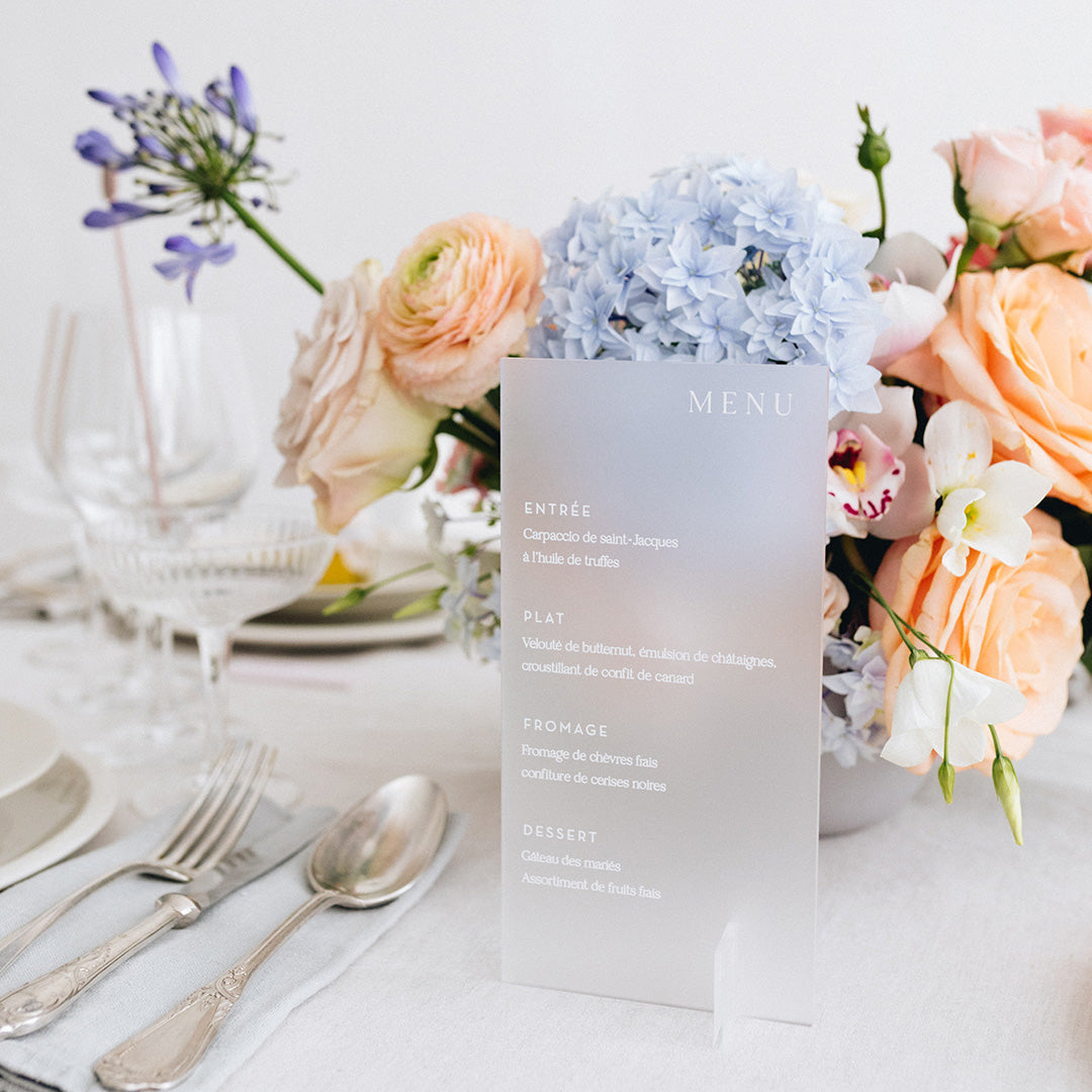 Découvrez les menus sur plexi mat coloré Lola. Ils sont imprimés et découpés dans notre atelier et à personnaliser avec votre texte.