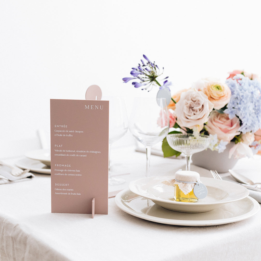 Les menus personnalisés Les Mignonneries permettront à vos invités de découvrir le repas le jour de votre évènement de manière élégante et raffinés. Une jolie touche à poser sur socle au centre de la table ou bien dans l’assiette de chaque invité.