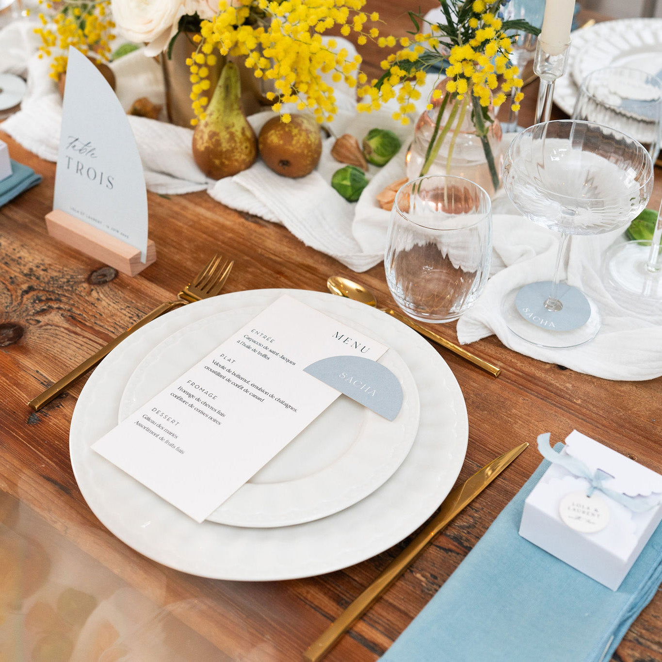Les menus personnalisés Les Mignonneries permettront à vos invités de découvrir le repas le jour de votre évènement de manière élégante et raffinés. Une jolie touche à poser sur socle au centre de la table ou bien dans l’assiette de chaque invité.