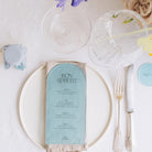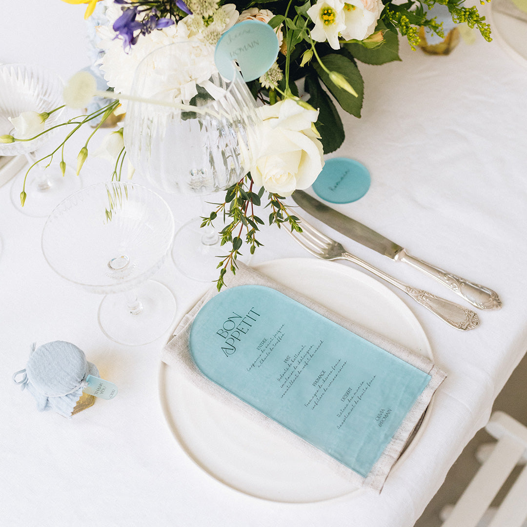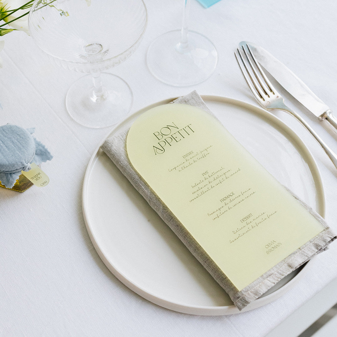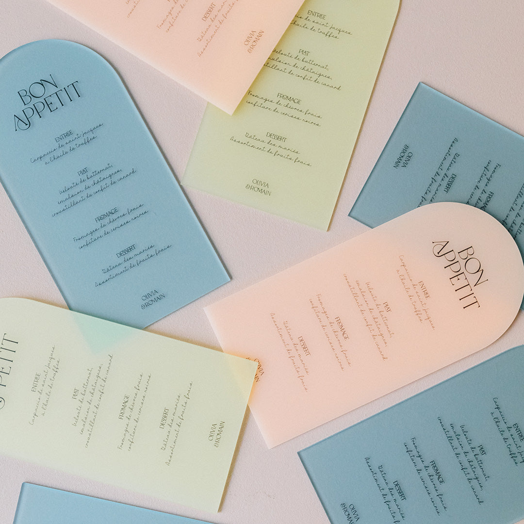 Découvrez les menus sur plexi givré coloré Pastel. Ils sont imprimés et découpés dans notre atelier et à personnaliser avec votre texte.