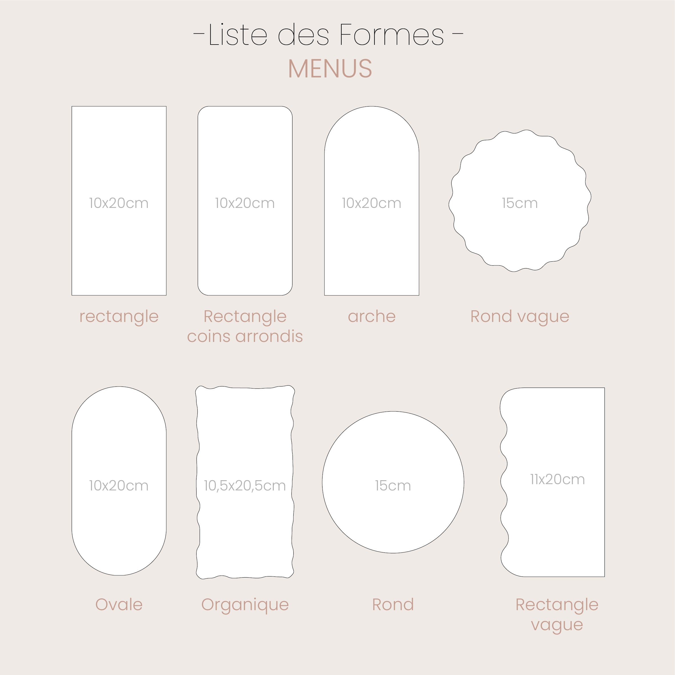 Créez vos menus sur-mesure chez les Mignonneries ! Découvrez nos différents matériaux et personnalisez votre visuel avec nos nombreuses polices au choix. La liste des polices n'étant pas exhaustive, n'hésitez pas à nous contacter pour discuter de la faisabilité de votre projet.