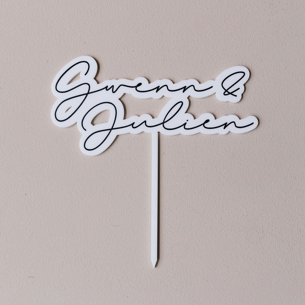 Découvrez notre cake topper Minimalist en plexiglass blanc imprimé noir. Imaginé par Les Mignonneries il est à personnaliser avec vos prénoms.