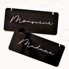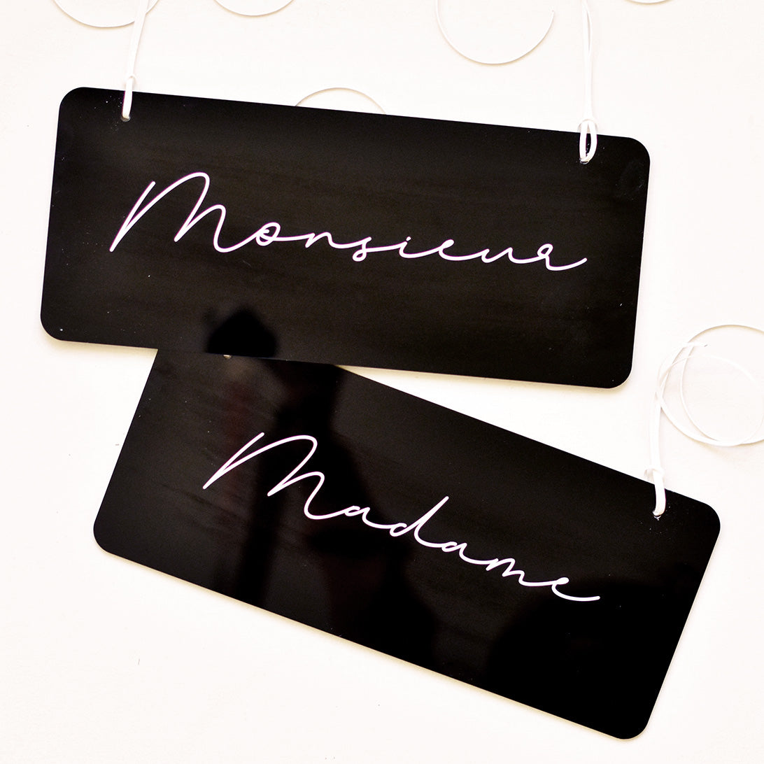 Découvrez les décors de chaises Minimalist. Des dos de chaises en plexi brillant noir imaginés par Les Mignonneries, à personnaliser. Ils sont en plexi, découpés et imprimés dans notre atelier.