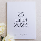 Celui de la collection "Minimalist" à la couverture rigide blanche, et au texte noir, imprimé dans notre atelier, vous séduira par sa simplicité et son élégance. Vous pourrez personnaliser vos prénoms et la date de votre événement sur la page de couverture.