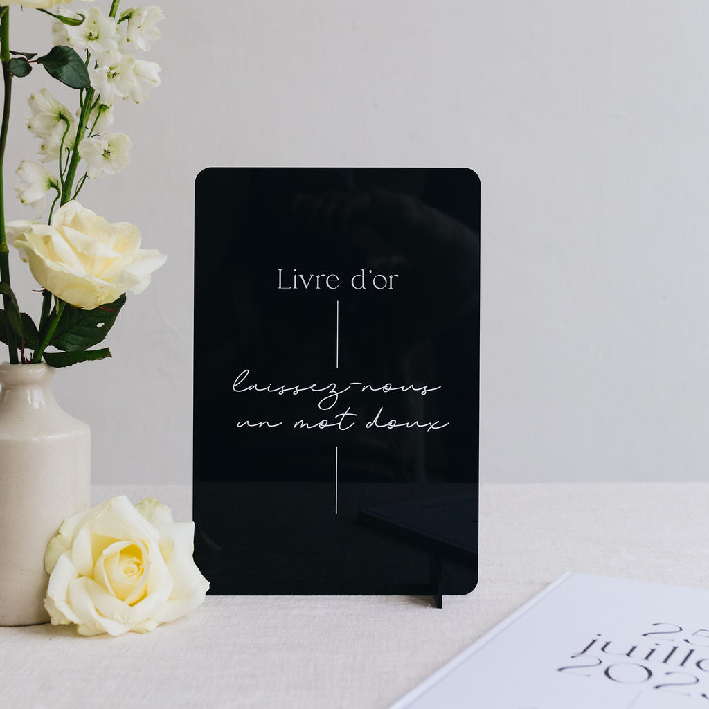 Découvrez notre panneau "Livre d'or" en plexi brillant noir. Imaginé par Les Mignonneries, il est à poser près de votre livre d'or le jour de votre mariage.