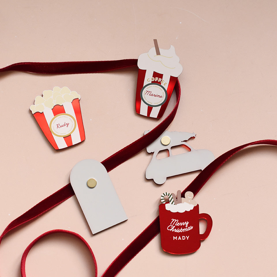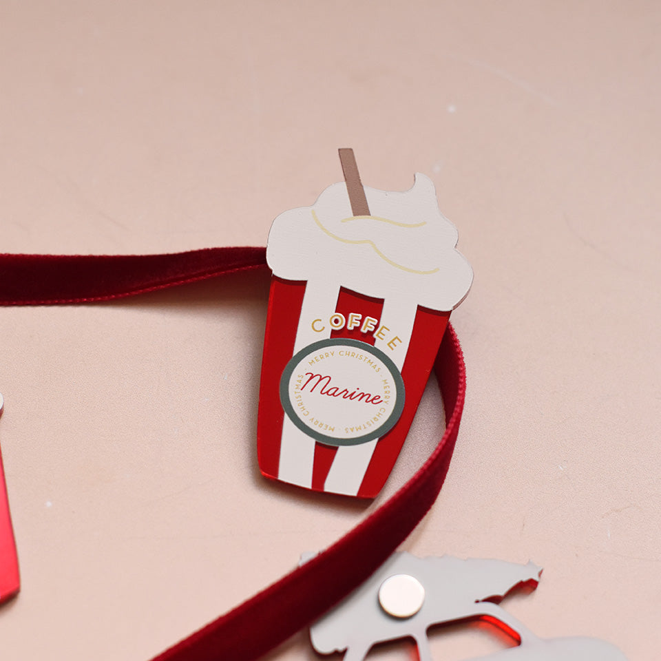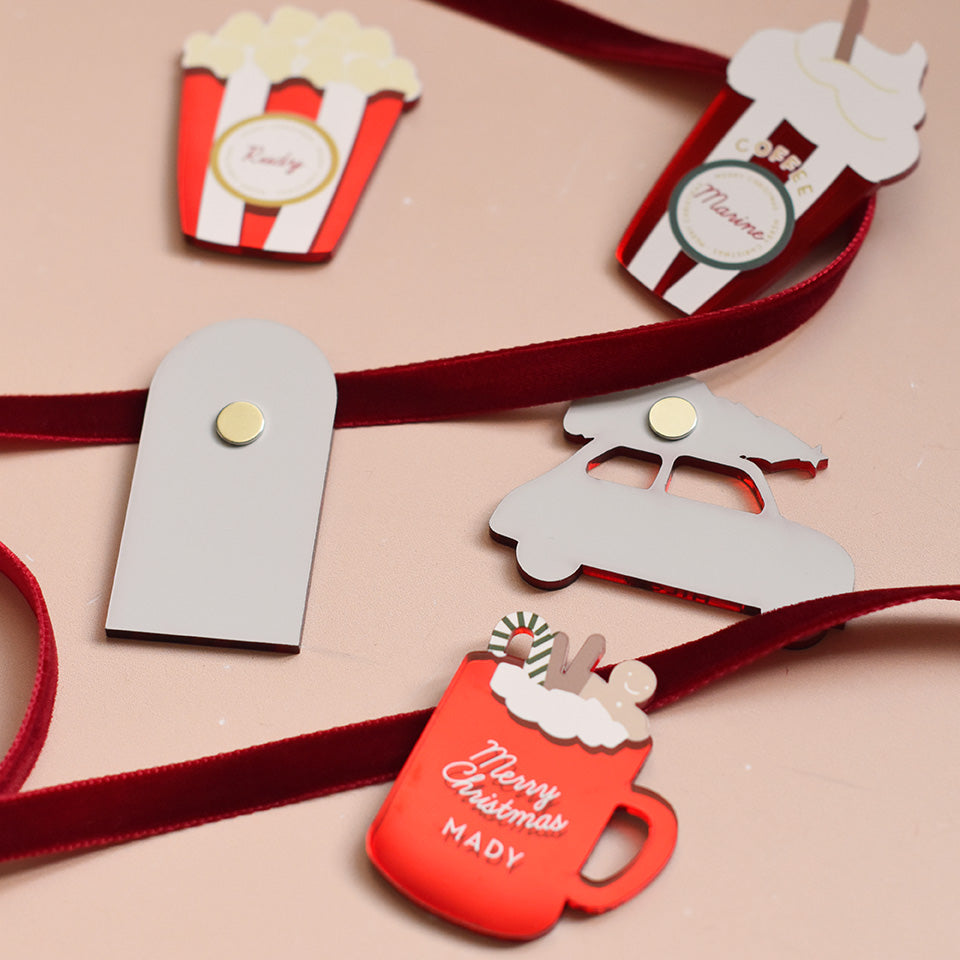 Découvrez les magnets café de Noël. Imaginés par les Mignonneries, et à personnaliser, ils sont entièrement créés dans notre atelier. Profitez d'une création unique disponible dans deux coloris principaux : rose (baby pink) et miroir rouge.