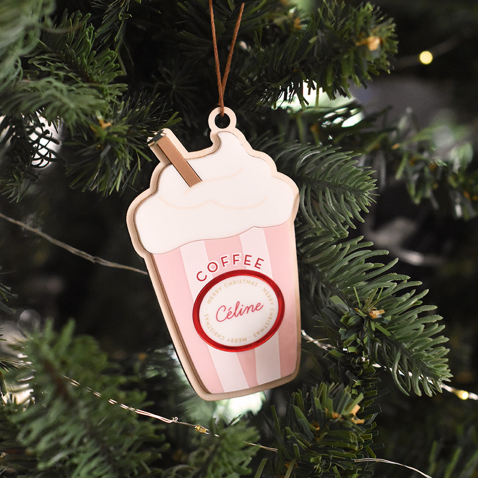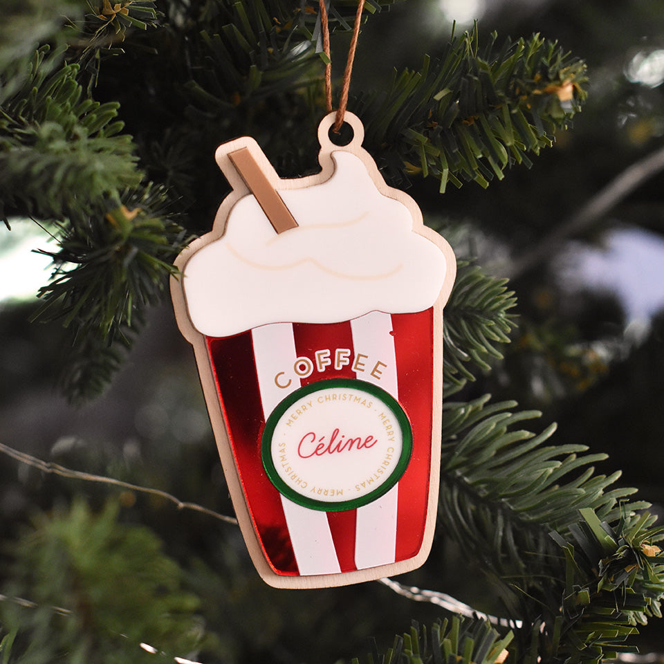 Découvrez notre ornement de sapin "Café" de Noël les mignonneries. A personnaliser avec le prénom de votre choix, il est disponible dans deux coloris principaux : rose (baby pink) et miroir rouge.