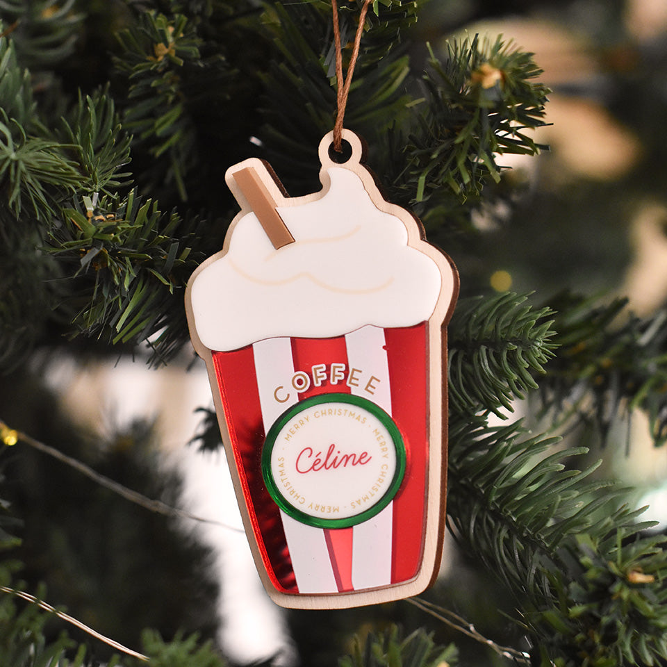 Découvrez notre ornement de sapin "Café" de Noël les mignonneries. A personnaliser avec le prénom de votre choix, il est disponible dans deux coloris principaux : rose (baby pink) et miroir rouge.