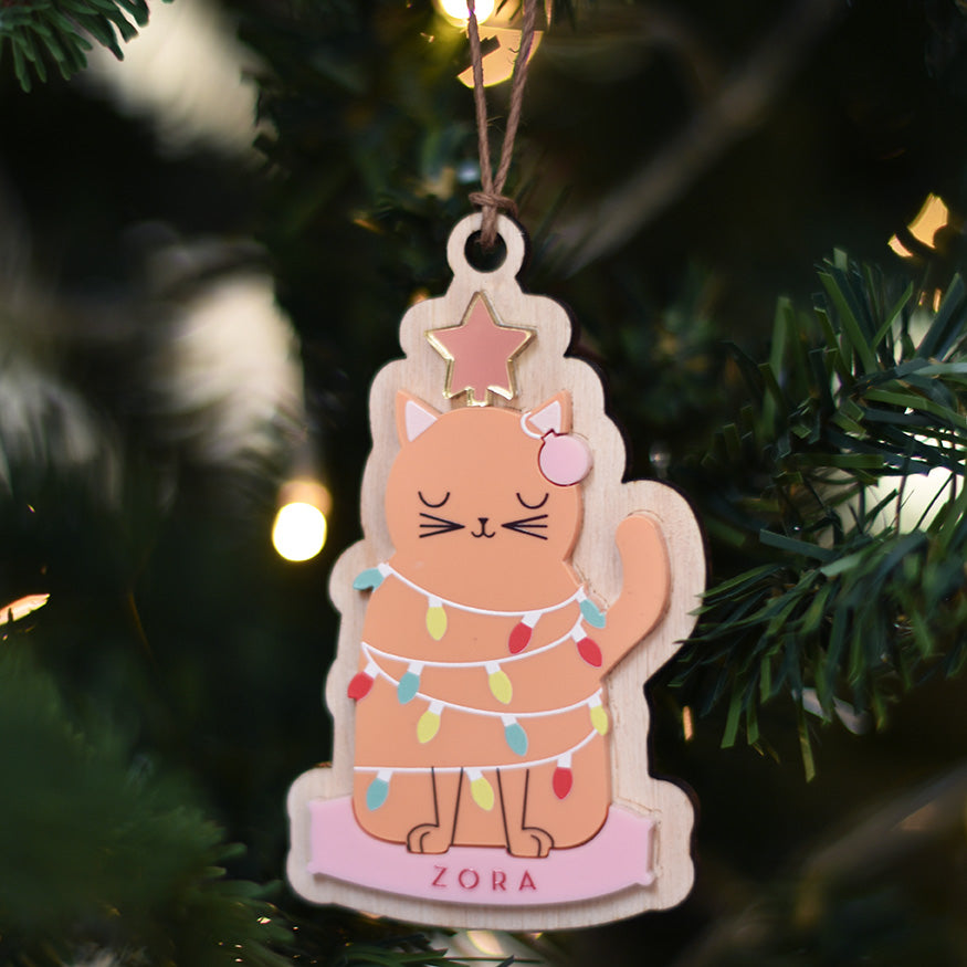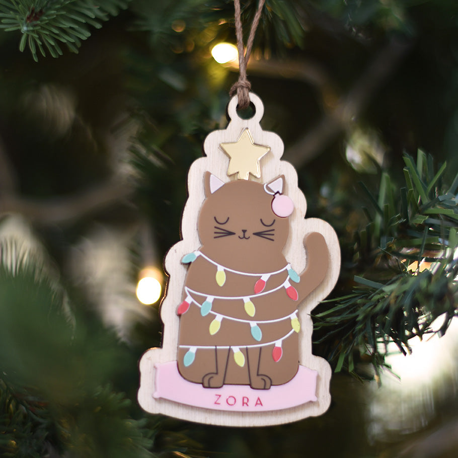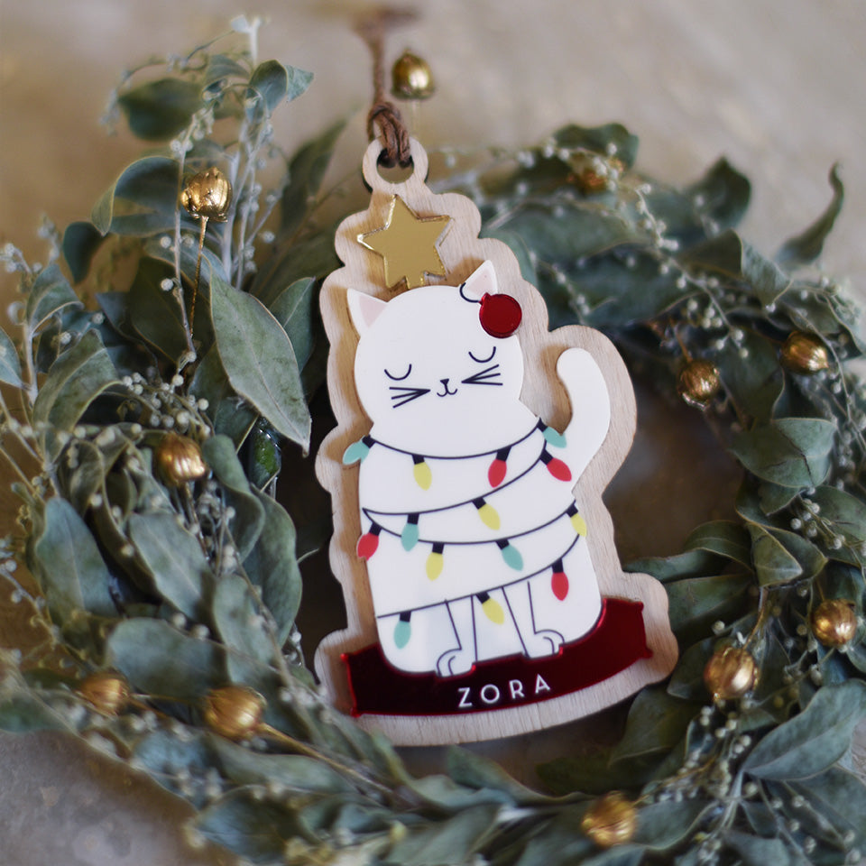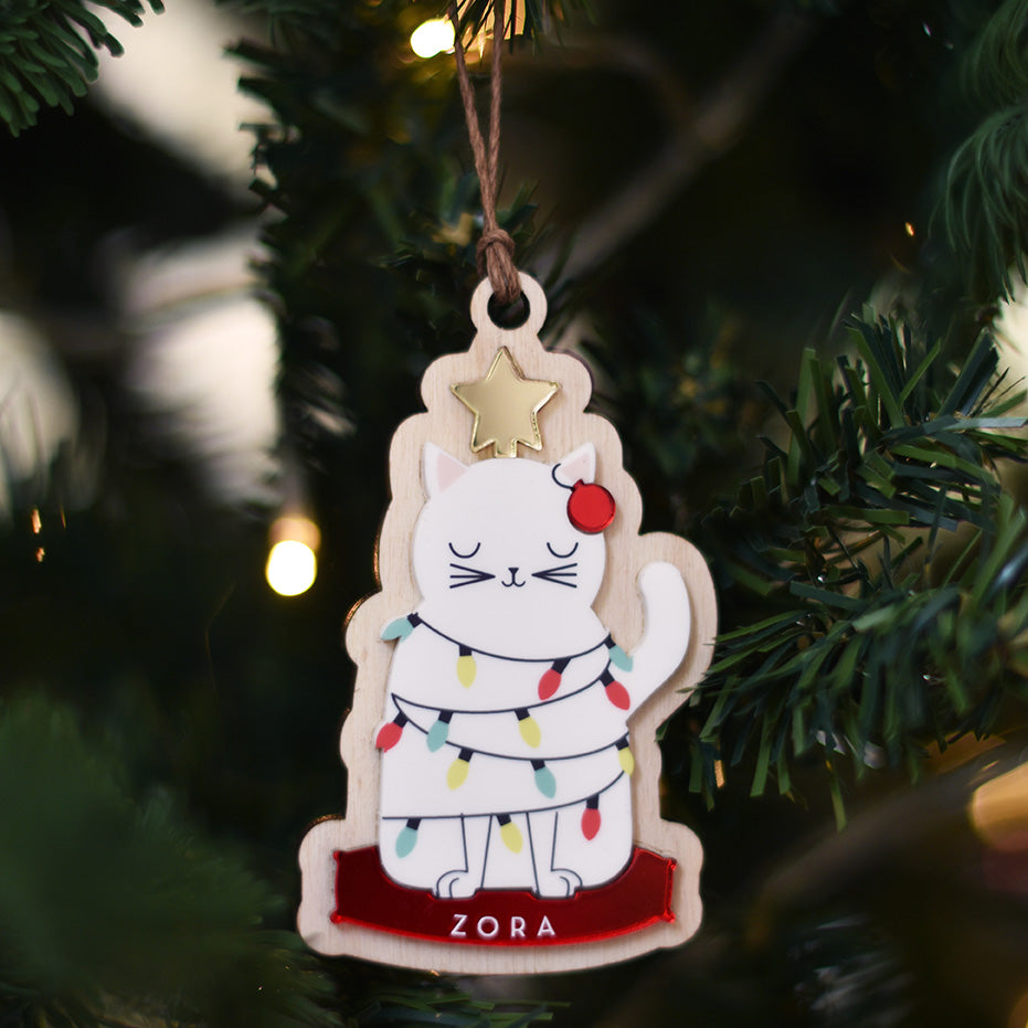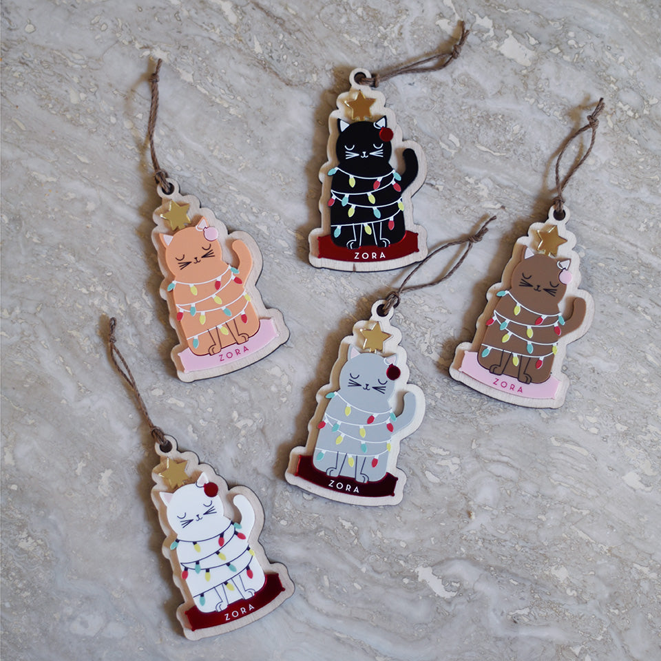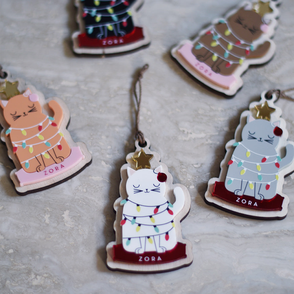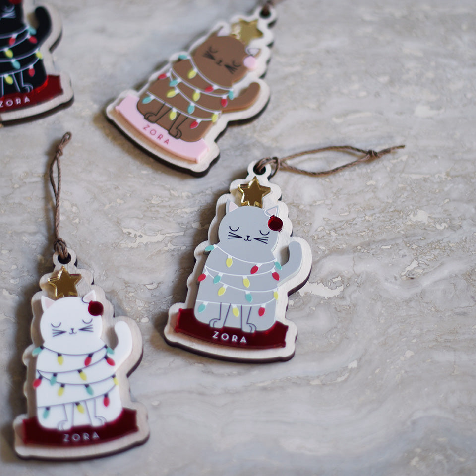 Découvrez notre ornement de sapin "Chat" de Noël les mignonneries. A personnaliser avec le nom de votre minou préféré, il est disponible dans cinq coloris : blanc, noir, roux, marron et gris. Son petit cousin est également disponible en doré, rouge ou rose.