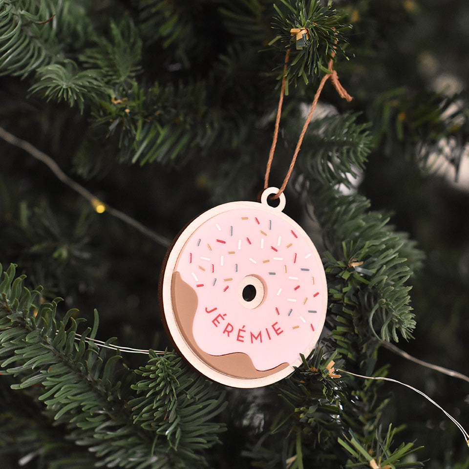 Découvrez notre ornement de sapin "Donut" de Noël les mignonneries. A personnaliser avec le prénom de votre choix, il est disponible dans deux coloris principaux : rose (baby pink) et blanc.