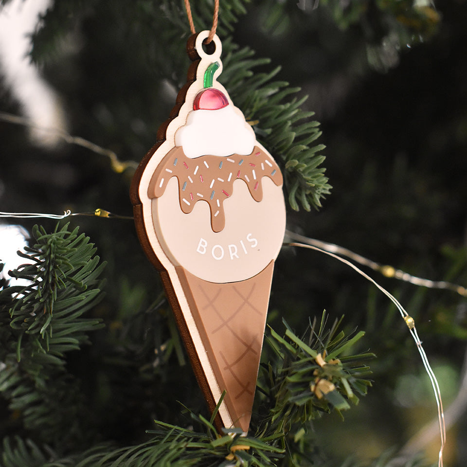 Découvrez notre ornement de sapin "Glace" de Noël les mignonneries. A personnaliser avec le prénom de votre choix, il est disponible dans deux coloris principaux : rose (baby pink) et marron (toffee).