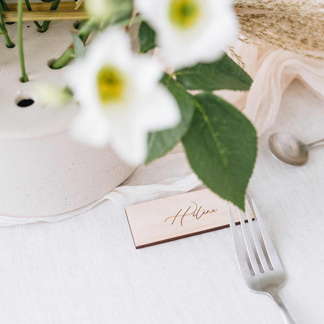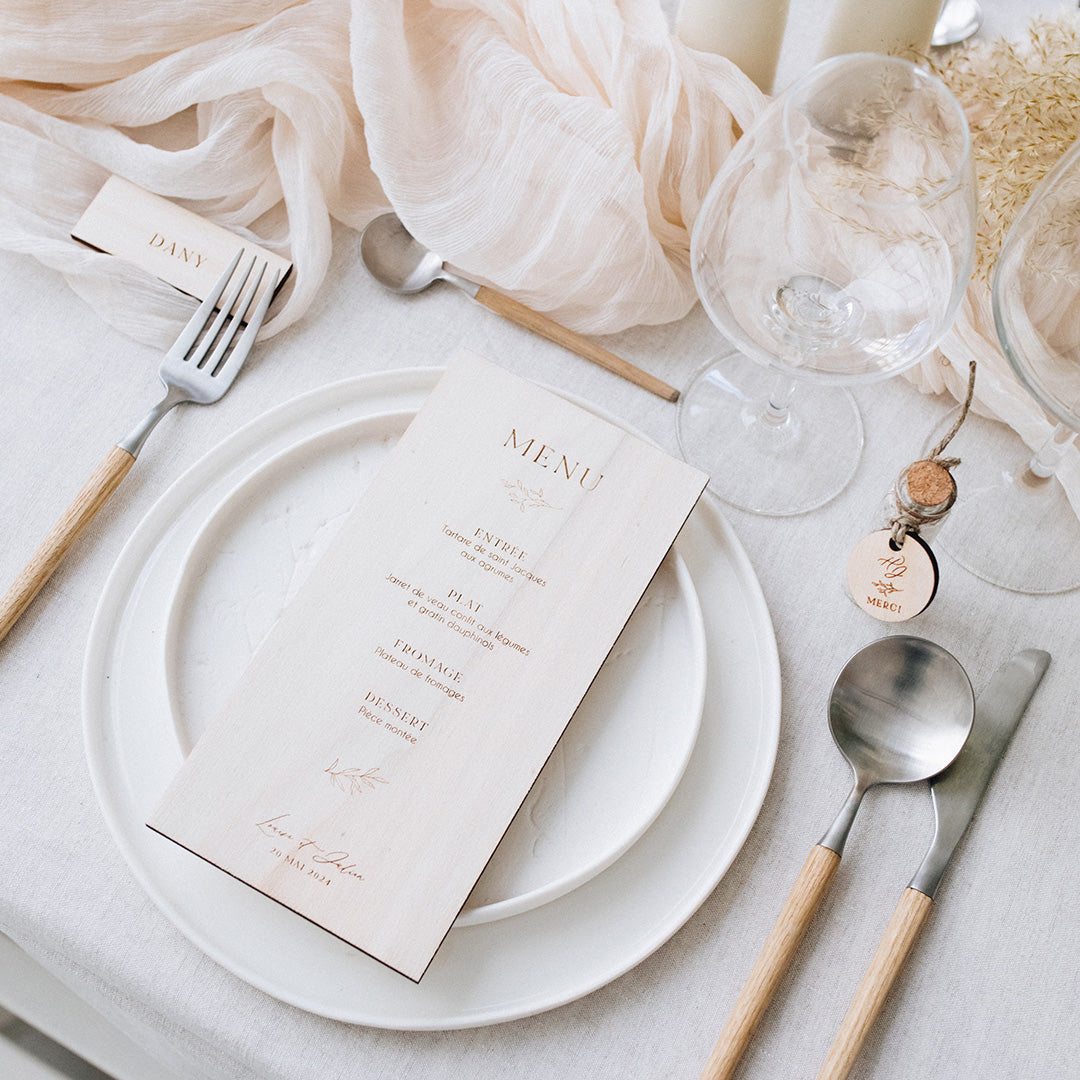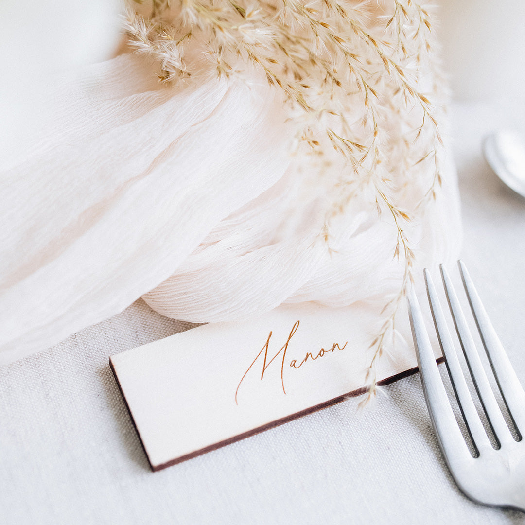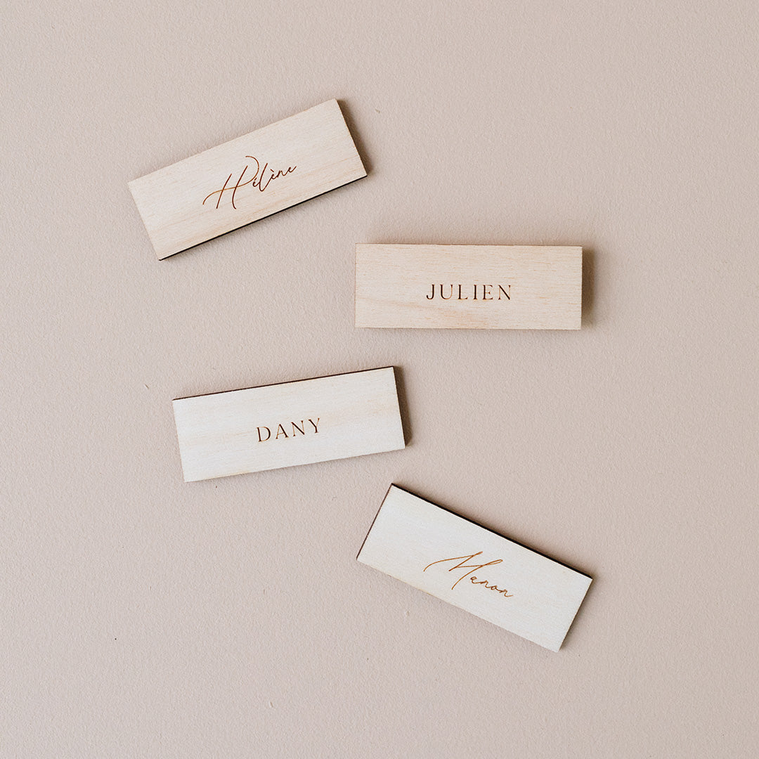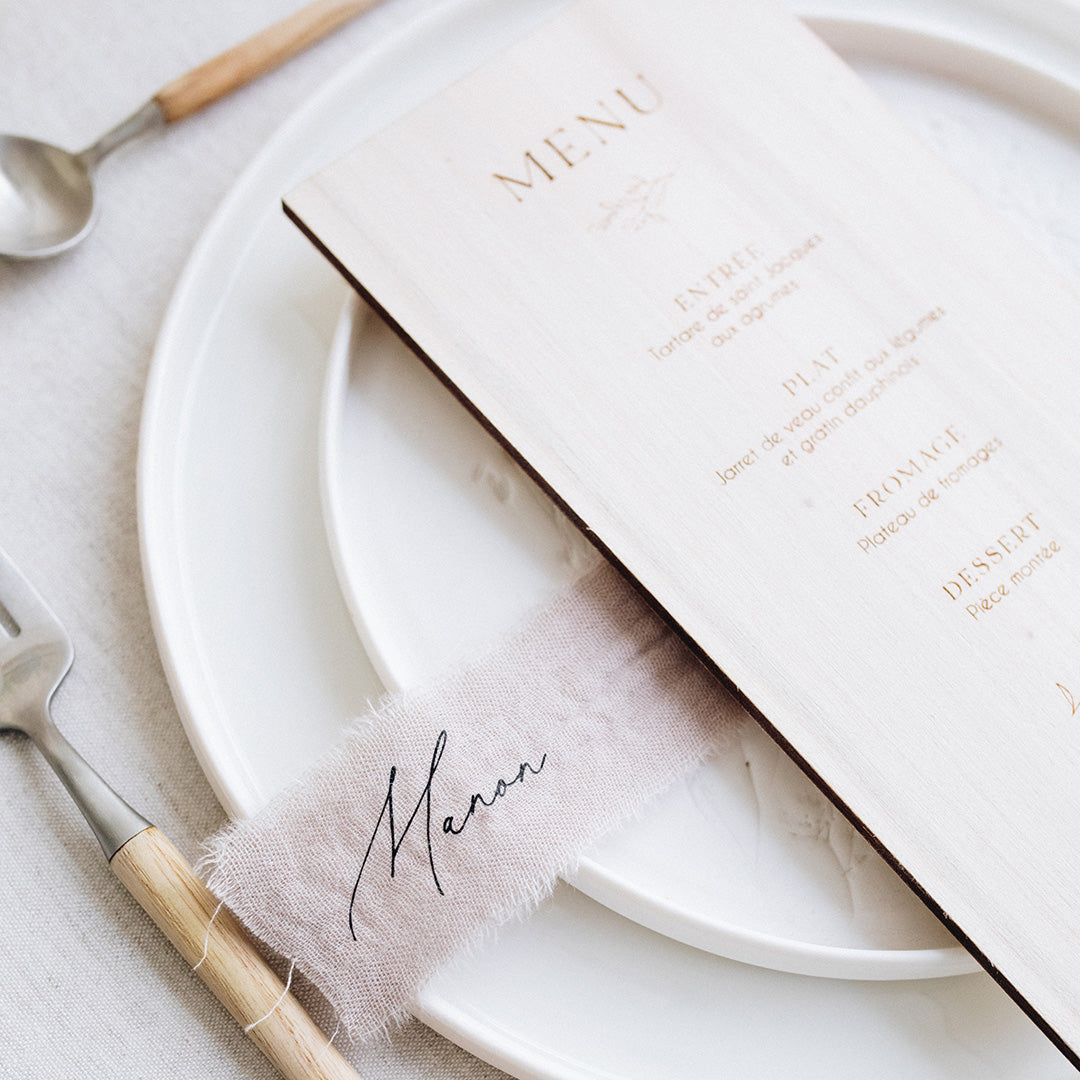 Une collection imaginée par Les Mignonneries. Personnalisez toute la décoration de votre événement avec le thème Nomad. Un style boho chic grâce à un mélange de tissu, de l’or et du bois gravé.