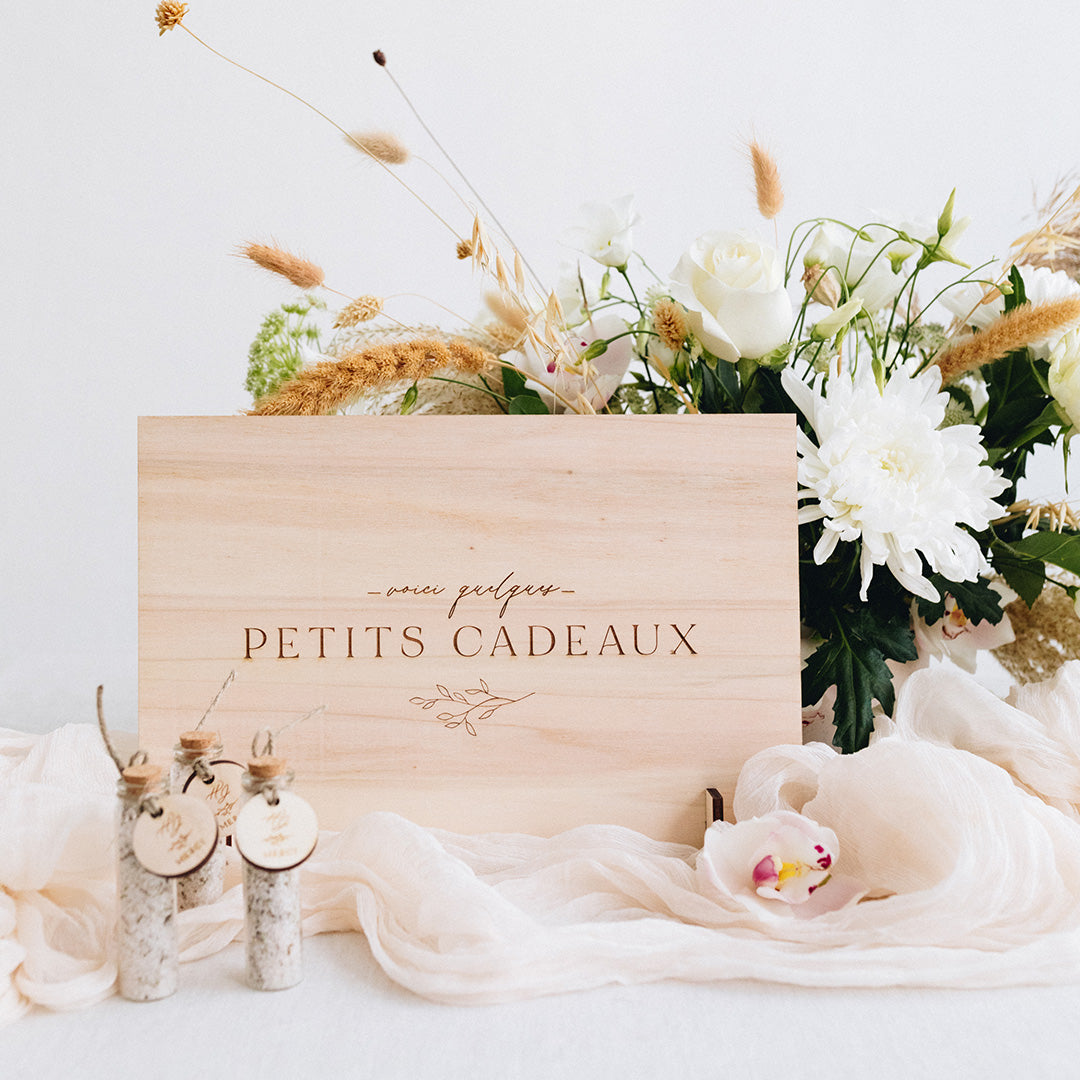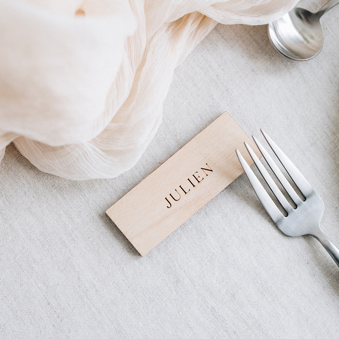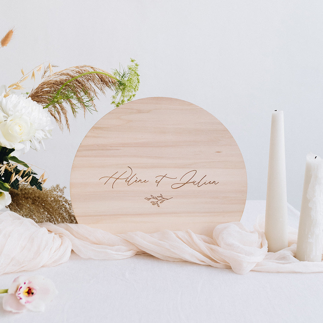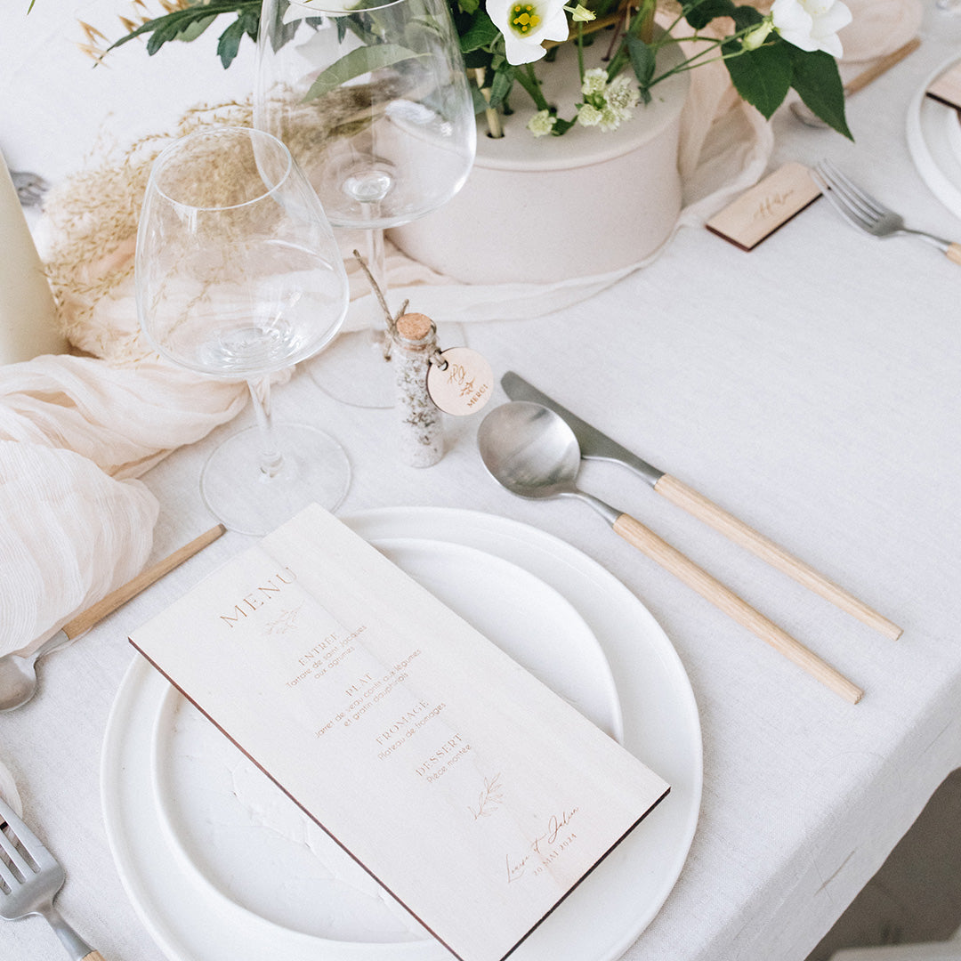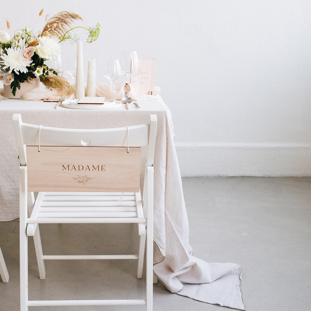 Une collection imaginée par Les Mignonneries. Personnalisez toute la décoration de votre événement avec le thème Nomad. Un style boho chic grâce à un mélange de tissu, de l’or et du bois gravé.