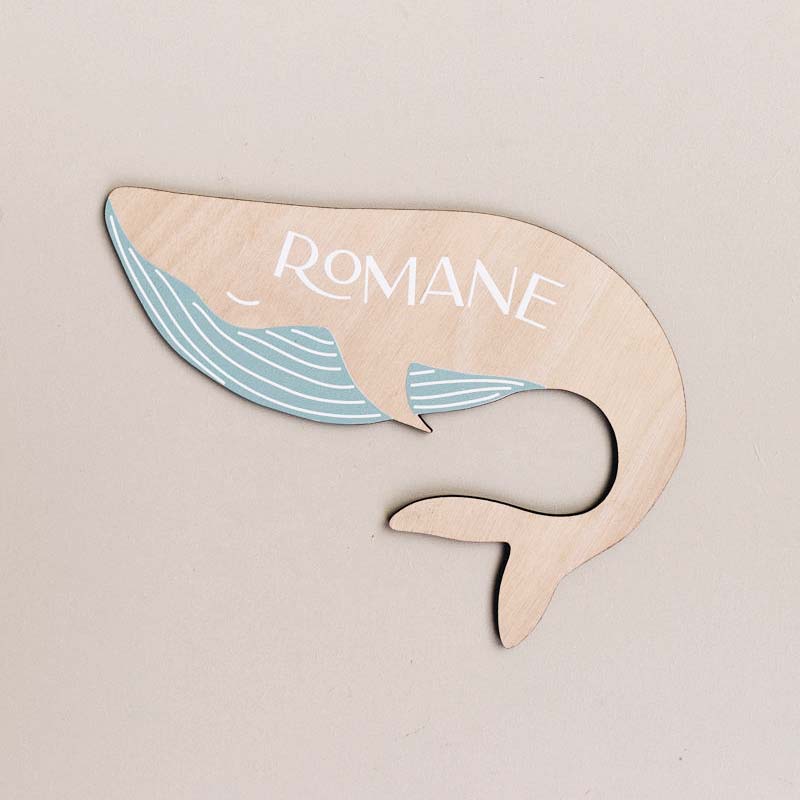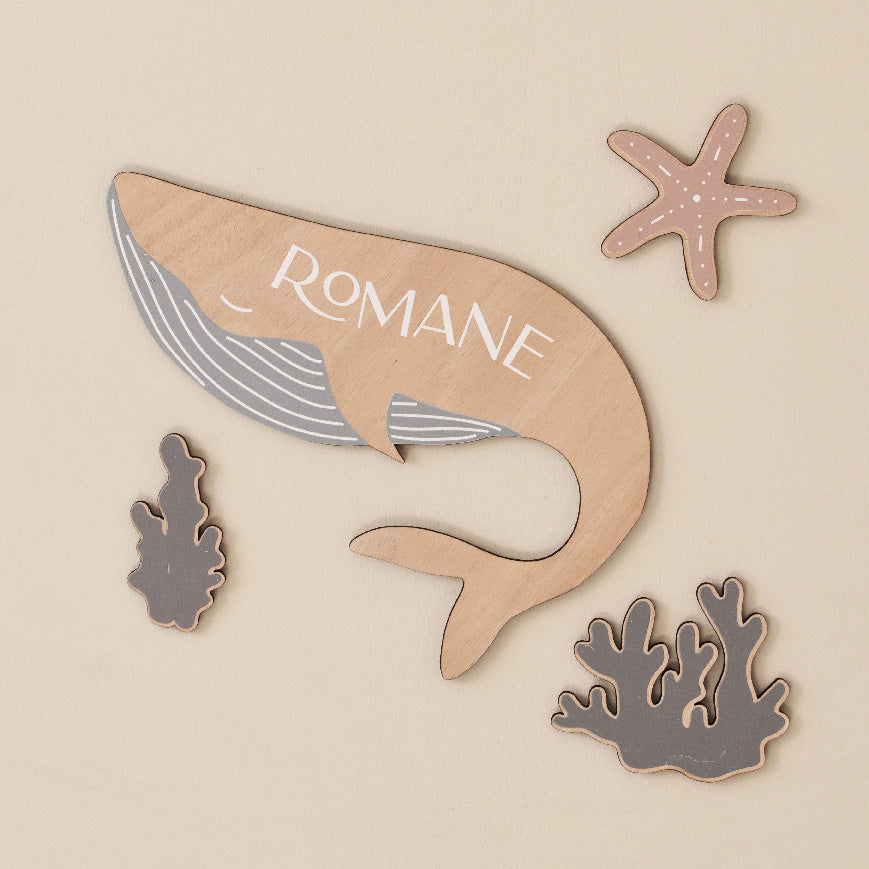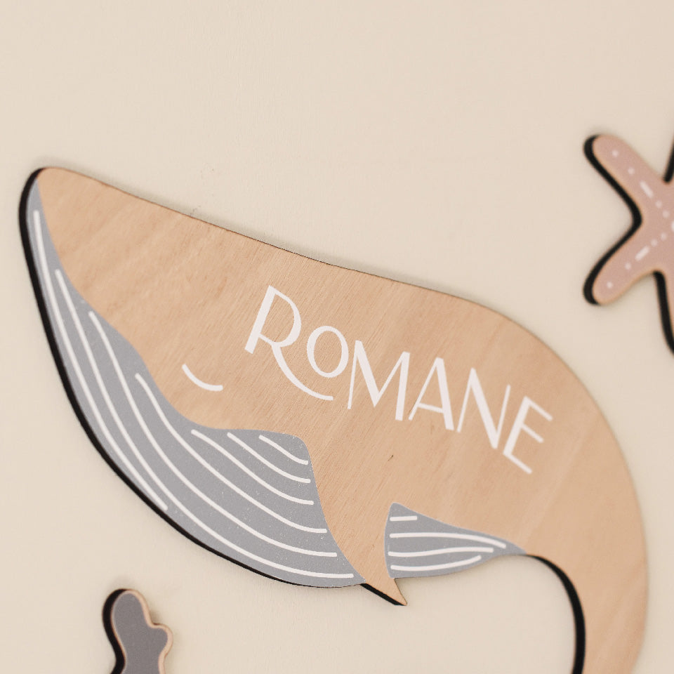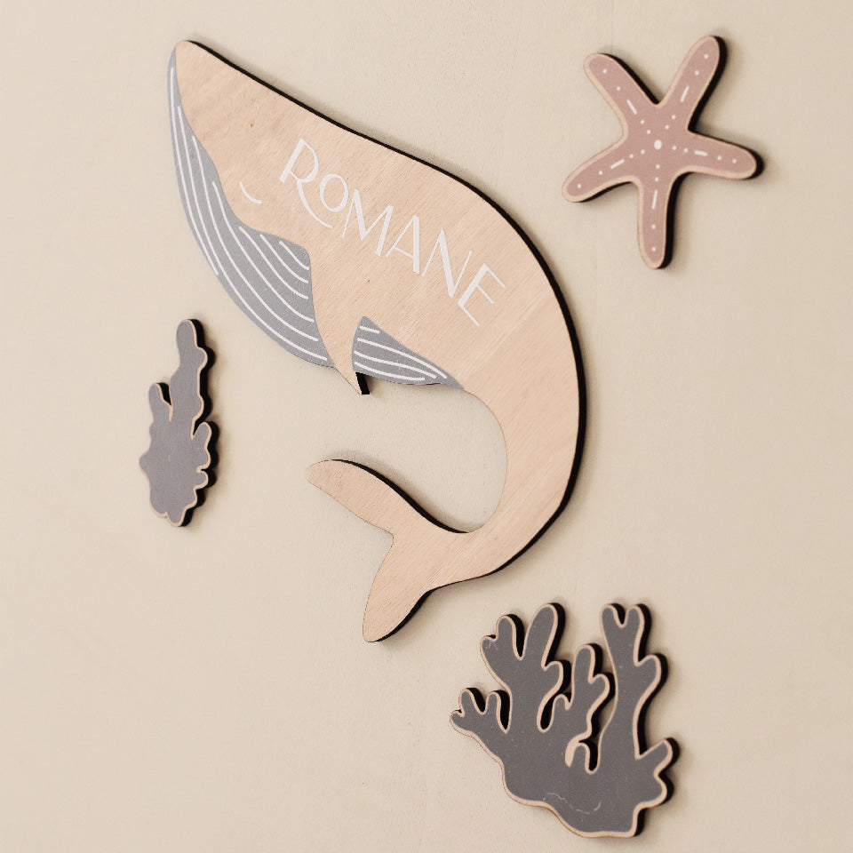 Découvrez ce décor Océan personnalisable. Un ensemble de quatre illustrations dont une jolie baleine imaginées par Les Mignonneries, à fixer au mur grâce à l'adhésif dont ils sont recouvert au dos. En bois imprimé, ils sont coupés et imprimés dans notre atelier.