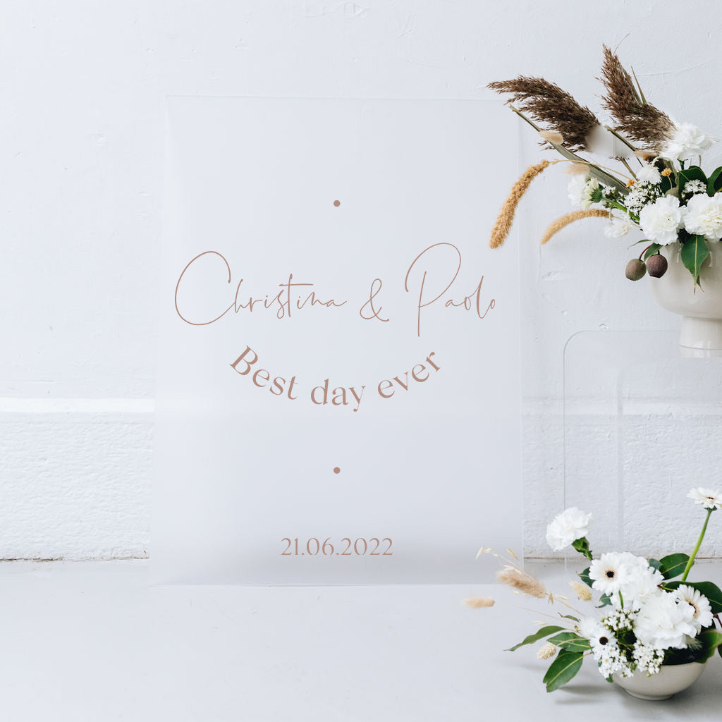 Découvrez notre panneau d'accueil Best Day en plexi givré. Imaginé par les Mignonneries, et à personnaliser avec vos prénoms et la date de votre mariage, il est entièrement créé dans notre atelier.