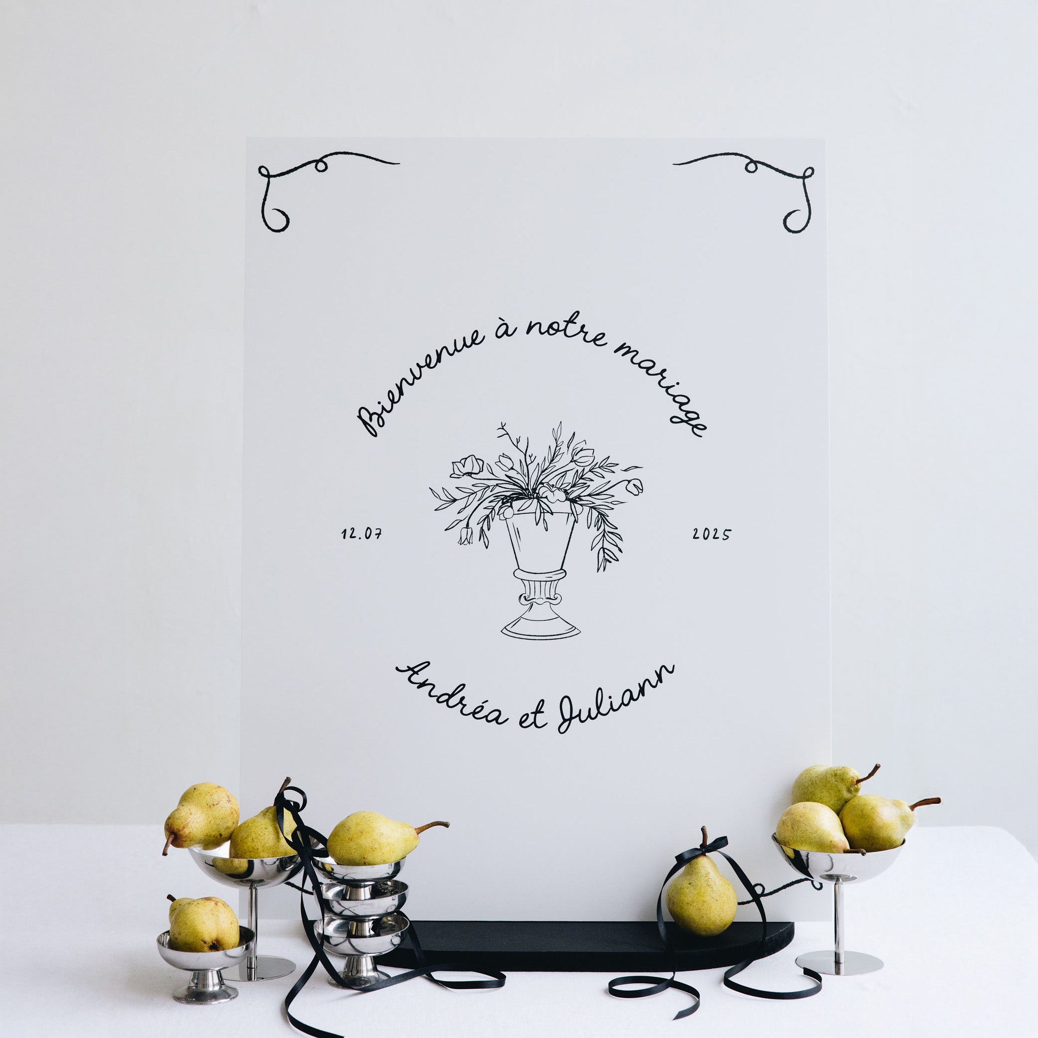 Découvrez notre panneau d'accueil Elena. À personnaliser avec vos prénoms et la date de votre mariage, il est entièrement créé dans notre atelier.