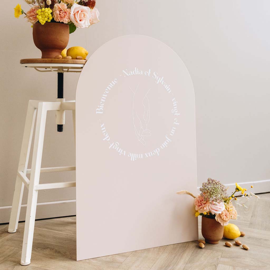 Découvrez notre panneau d'accueil en plexi nude Hands. Imaginé par les Mignonneries, et à personnaliser avec vos prénoms et la date de votre mariage, il est entièrement créé dans notre atelier.