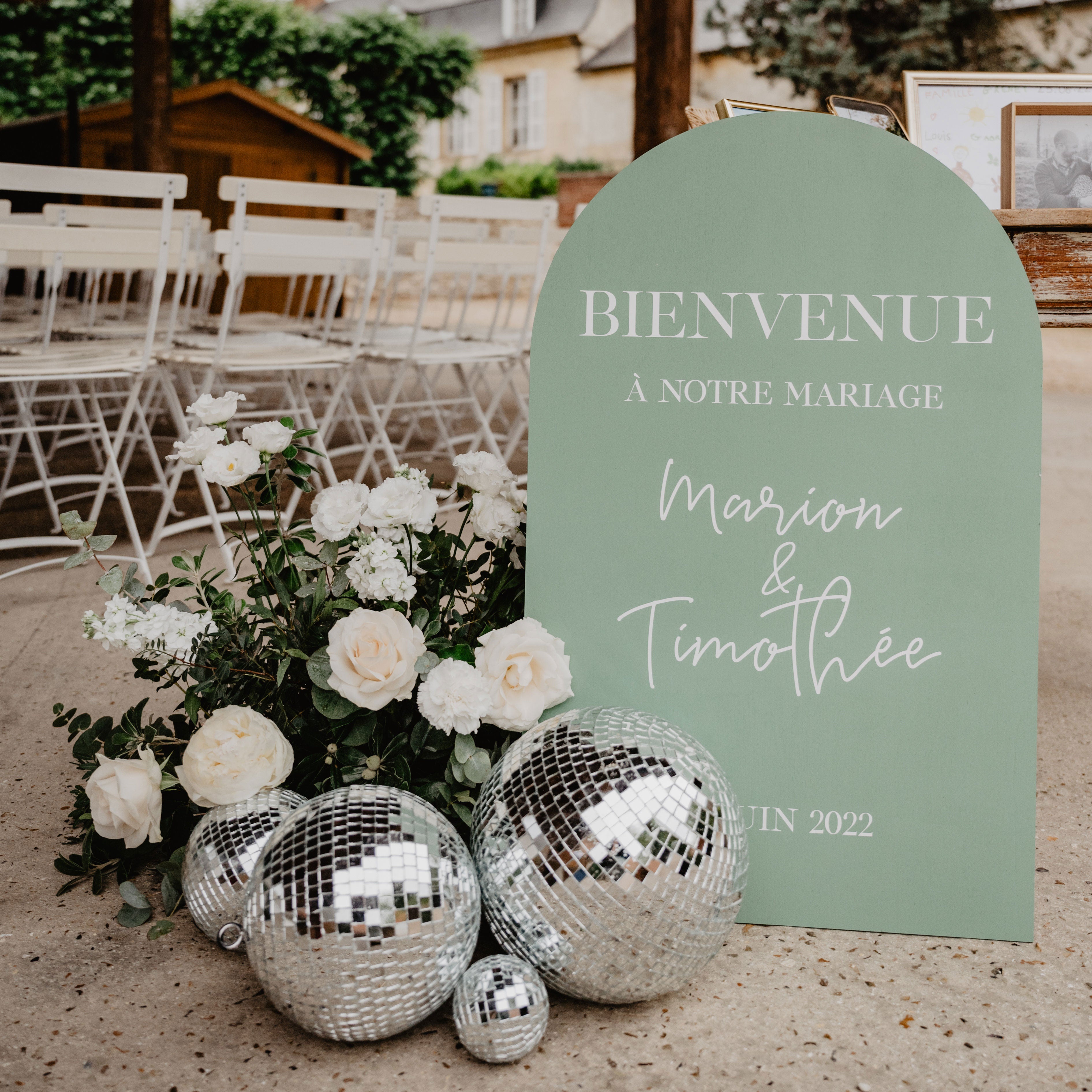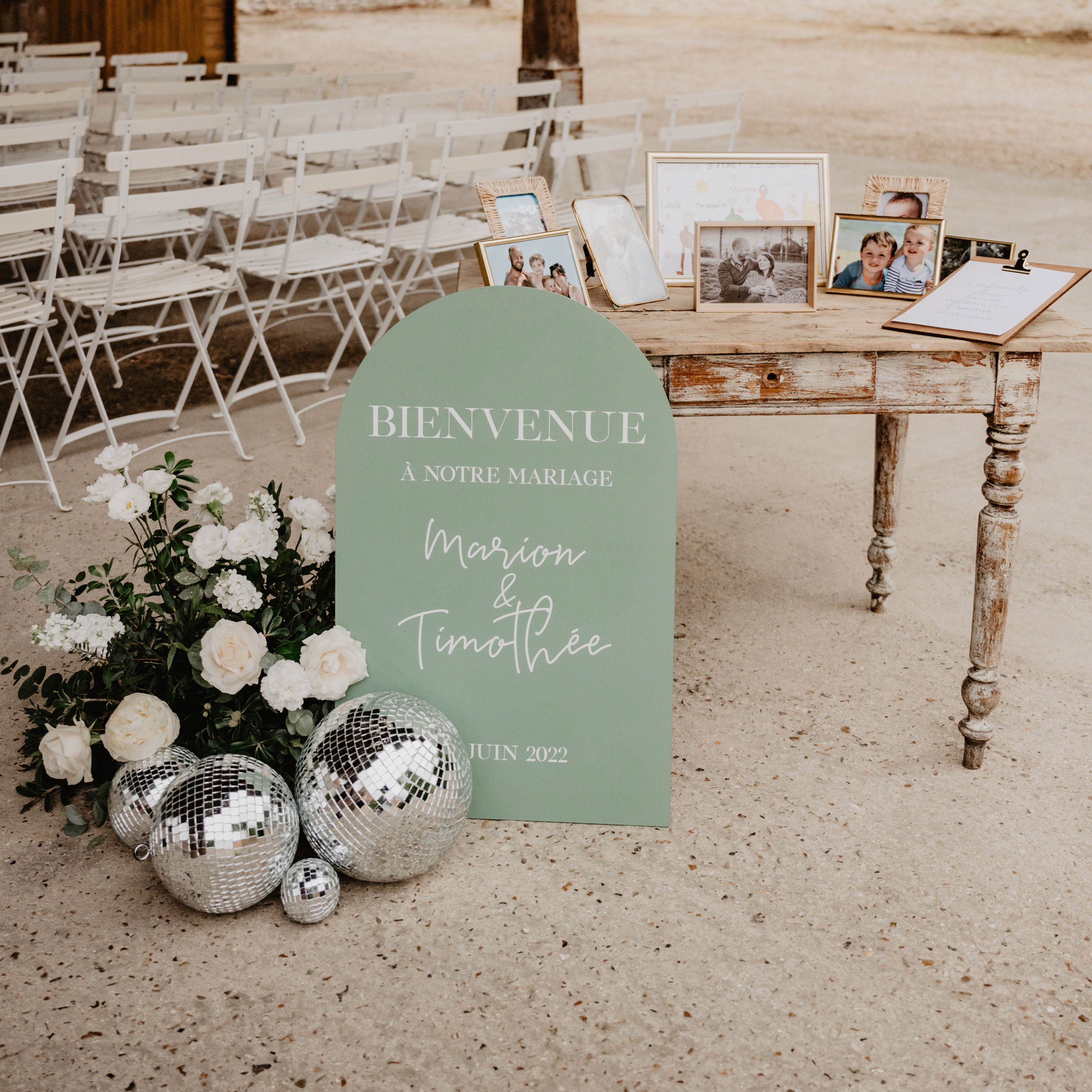 Découvrez notre panneau d'accueil en bois sauge "Mademoiselle C", à personnaliser avec vos prénoms et la date de votre mariage, il est entièrement créé dans notre atelier.