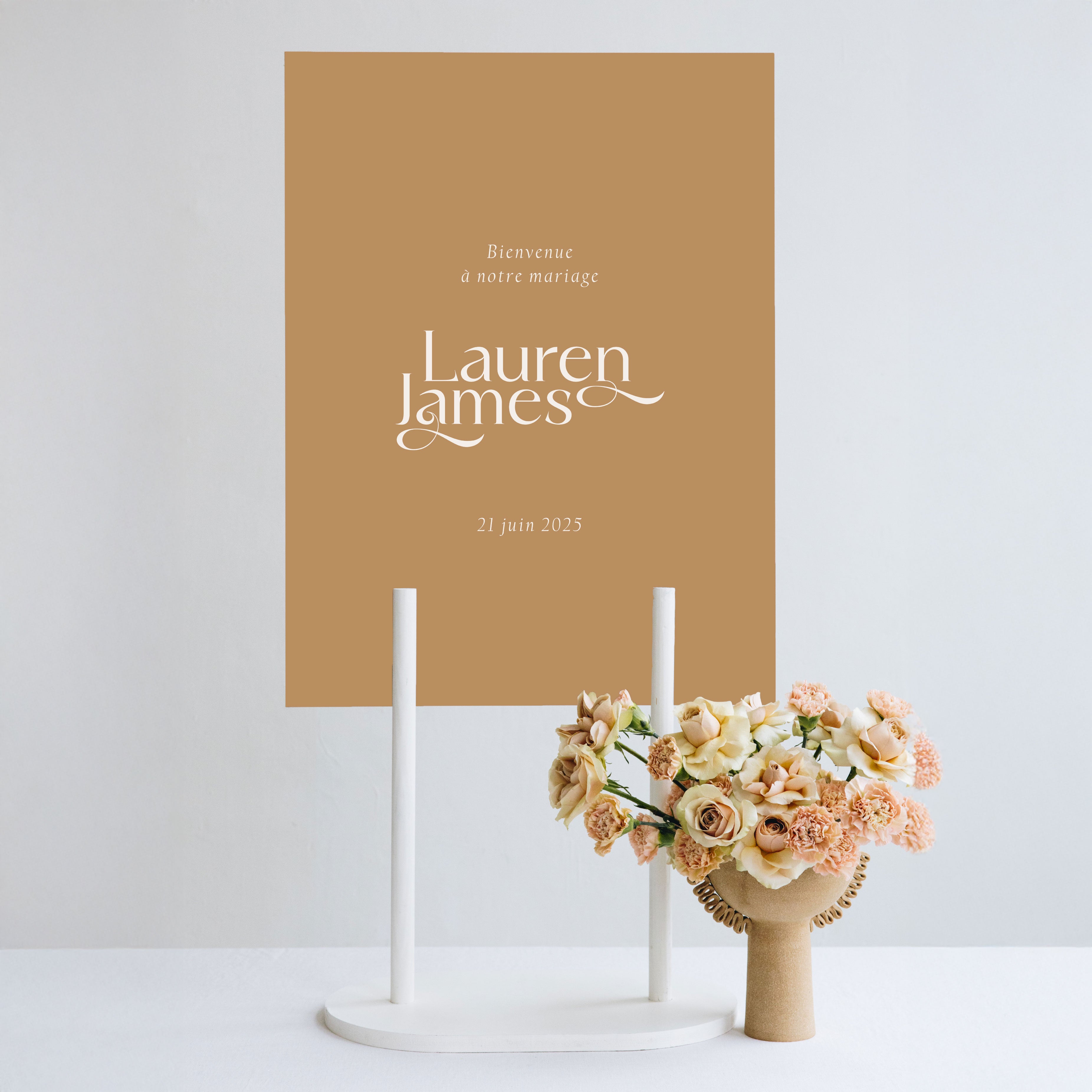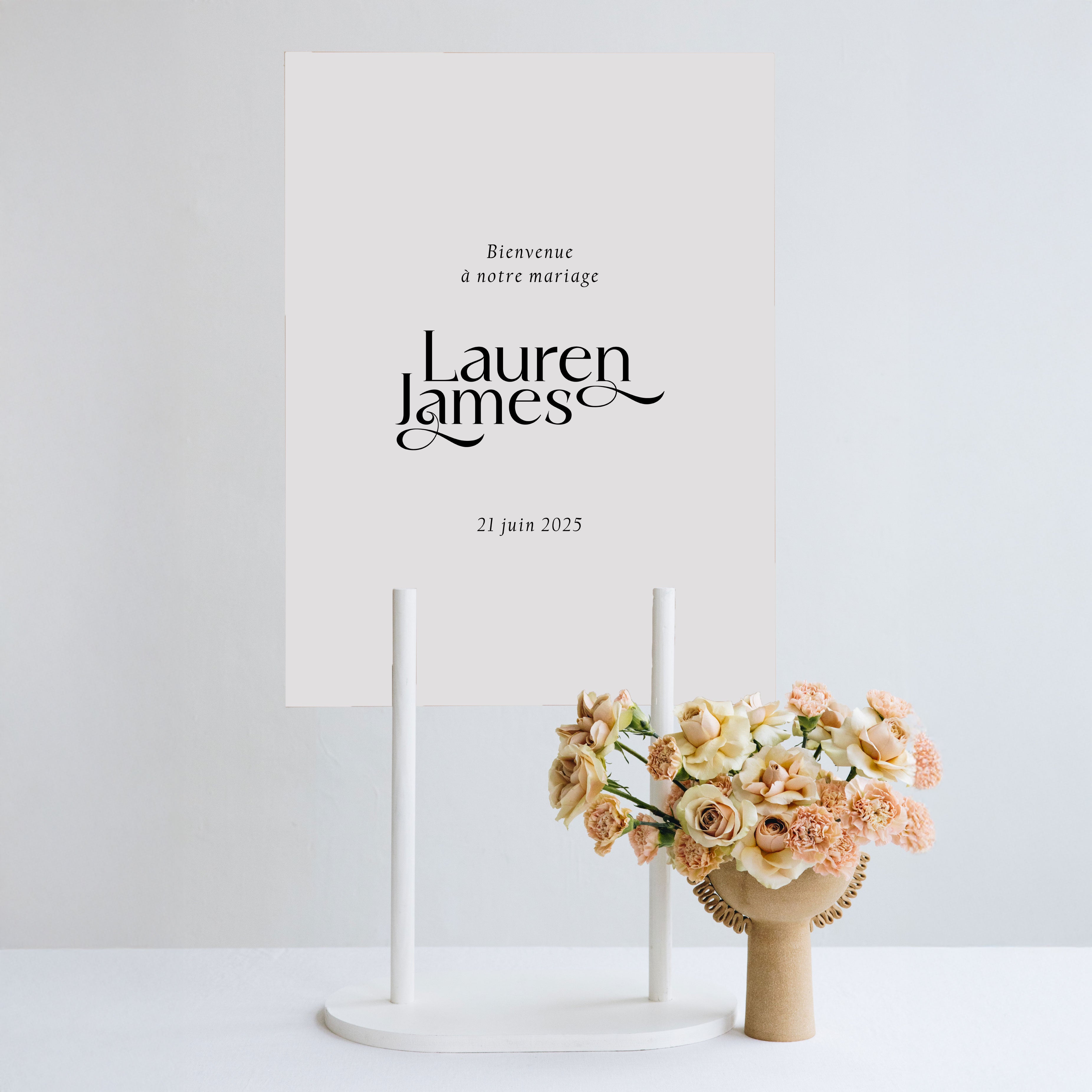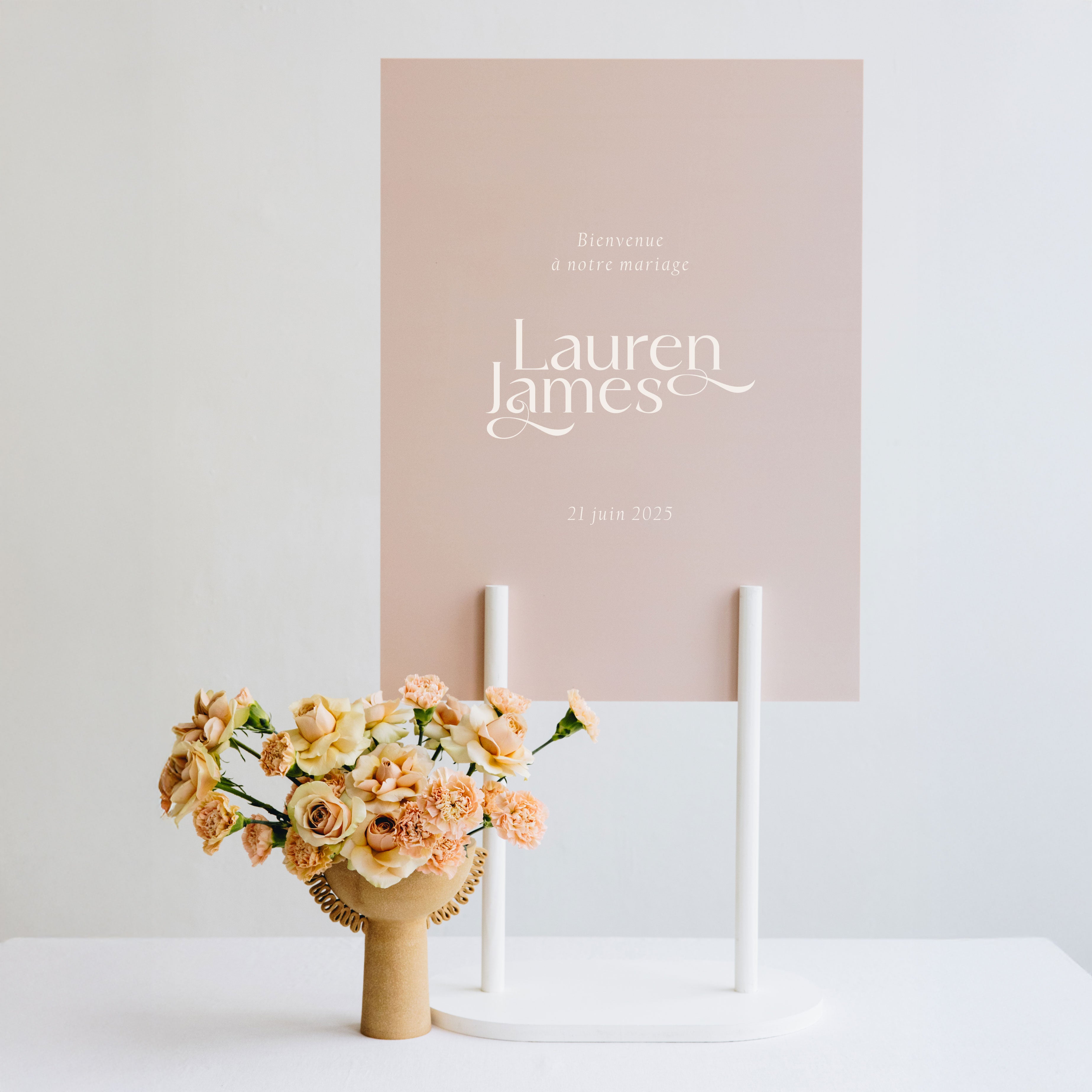 Découvrez notre panneau d'accueil Romane. À personnaliser avec vos prénoms et la date de votre mariage, il est entièrement créé dans notre atelier.
