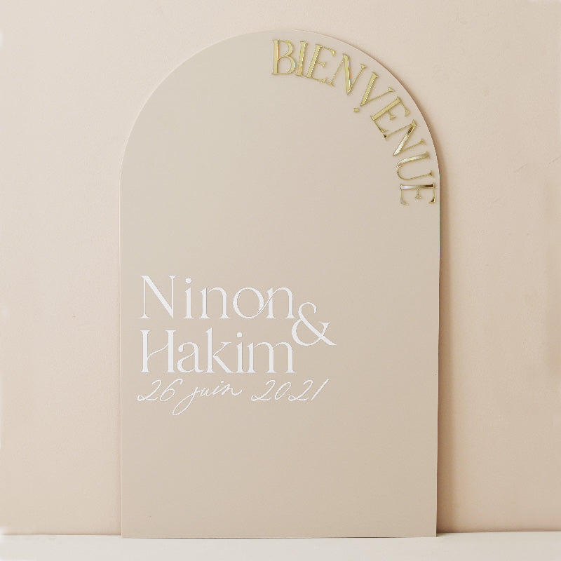 Découvrez notre panneau d'accueil en plexi nude Shape. Imaginé par les Mignonneries, et à personnaliser avec vos prénoms et la date de votre mariage, il est entièrement créé dans notre atelier.