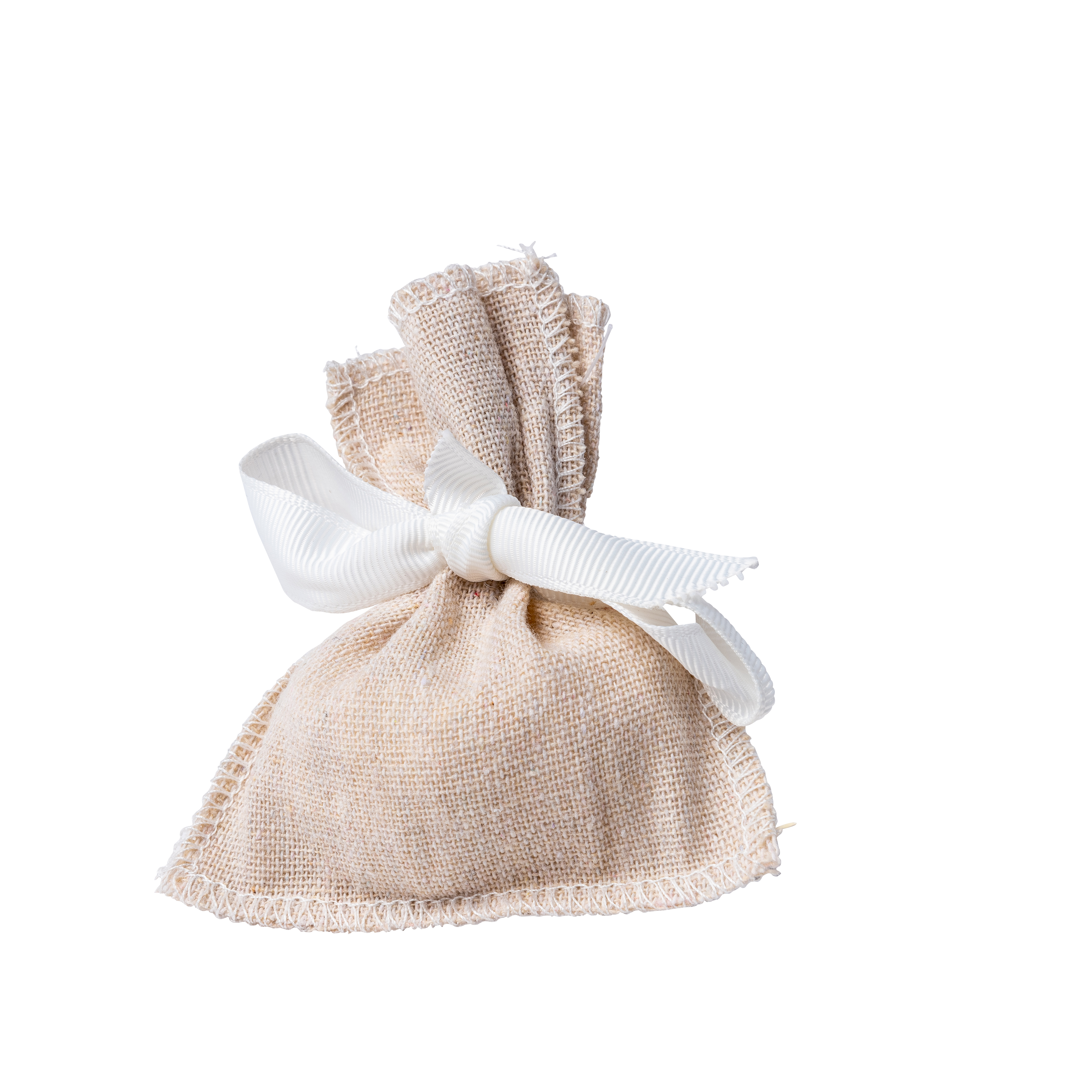 De jolis petits pochons en lin à ruban satinés blancs, proposés par les Mignonneries et à personnaliser avec nos tampons personnalisés et notre encre spéciale tissu, ou à l'aide de nos étiquettes personnalisées