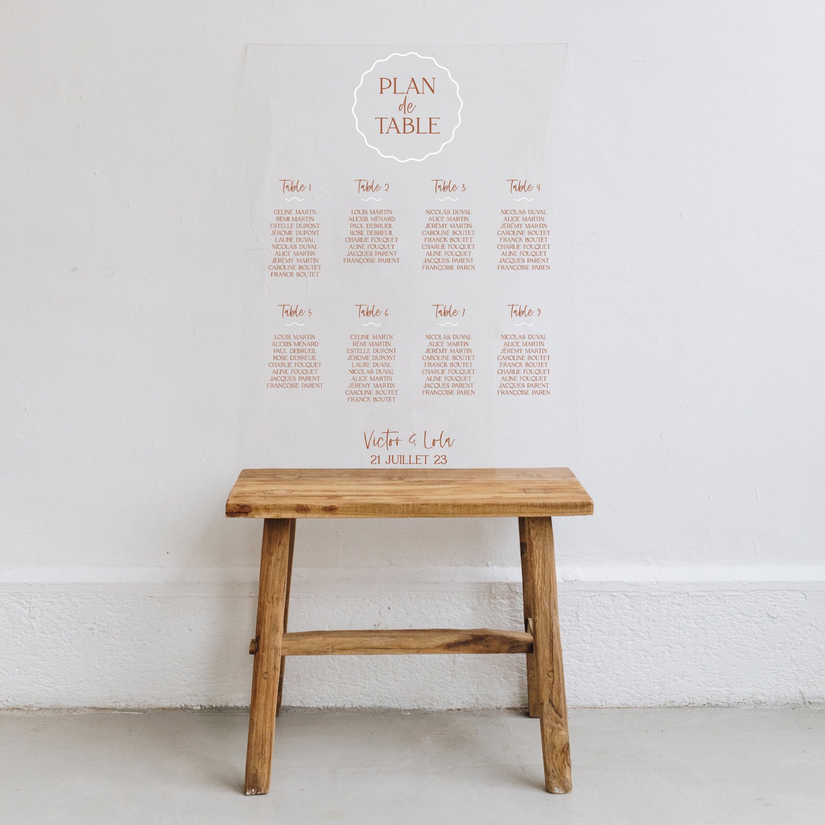Découvrez notre plan de table en plexi transparent imprimé "Curve". Imaginé par les Mignonneries, et à personnaliser avec les prénoms de vos invités, il est entièrement créé dans notre atelier.