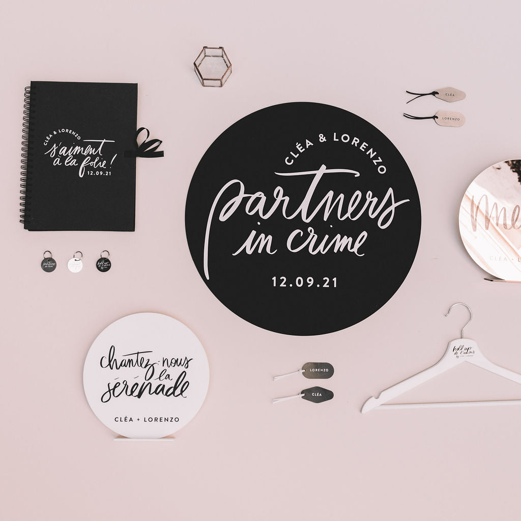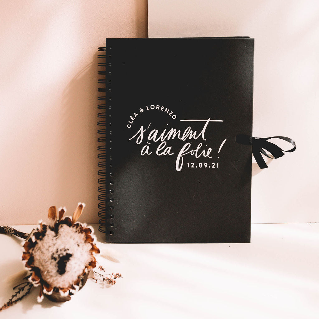 Celui-ci, a été imaginé par les Bandits events en collaboration avec les Mignonneries. A la couverture blanche ou noire, l'écriture personnalisée et le ruban. Profitez d'une création unique et sur mesure dont la calligraphie a été réalisée à la main par l'équipe des Bandits puis adaptée aux produits les Mignonneries. Vous pourrez personnaliser vos prénoms et la date de votre événement sur la page de couverture.