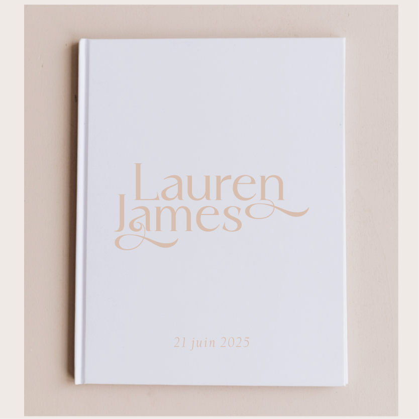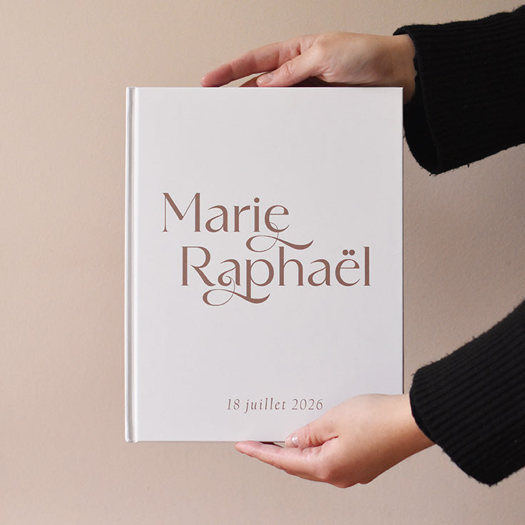 Ce livre d'or fait partie de notre collection Romane, une collection moderne qui joue avec une police originale et des matériaux aux tons doux et chaleureux.