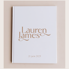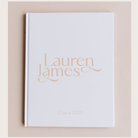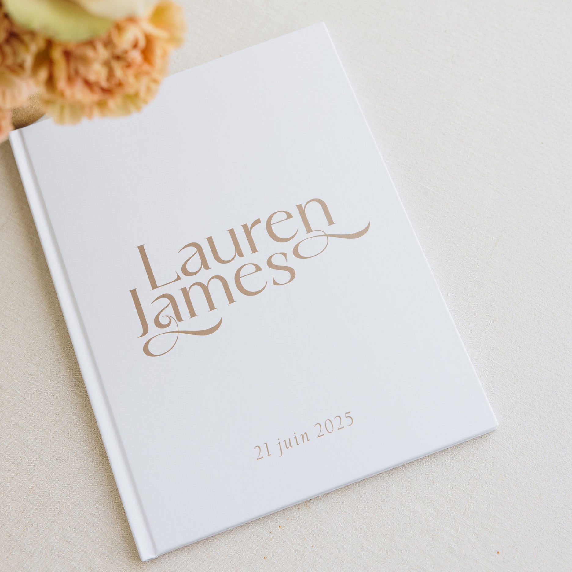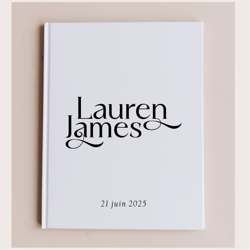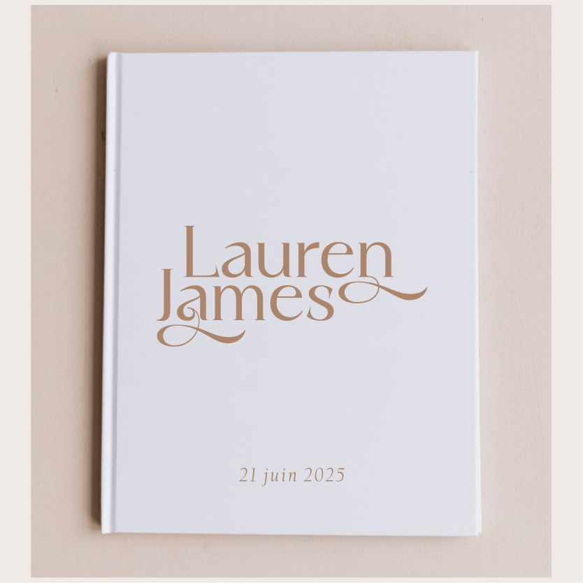 Celui de la collection "Romane" à la couverture rigide blanche, et au texte imprimé couleur dans notre atelier, vous séduira par son design moderne et son élégance. Vous pourrez personnaliser vos prénoms et la date de votre événement sur la page de couverture.