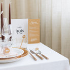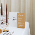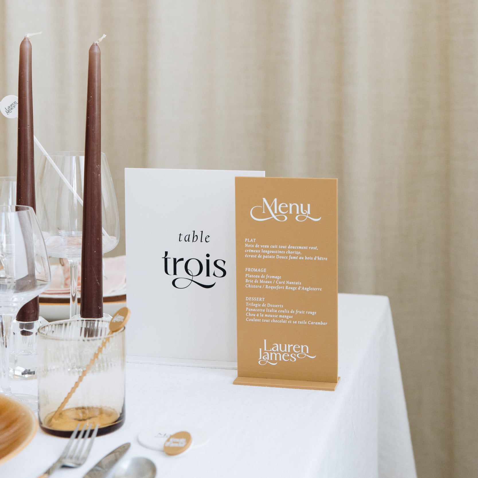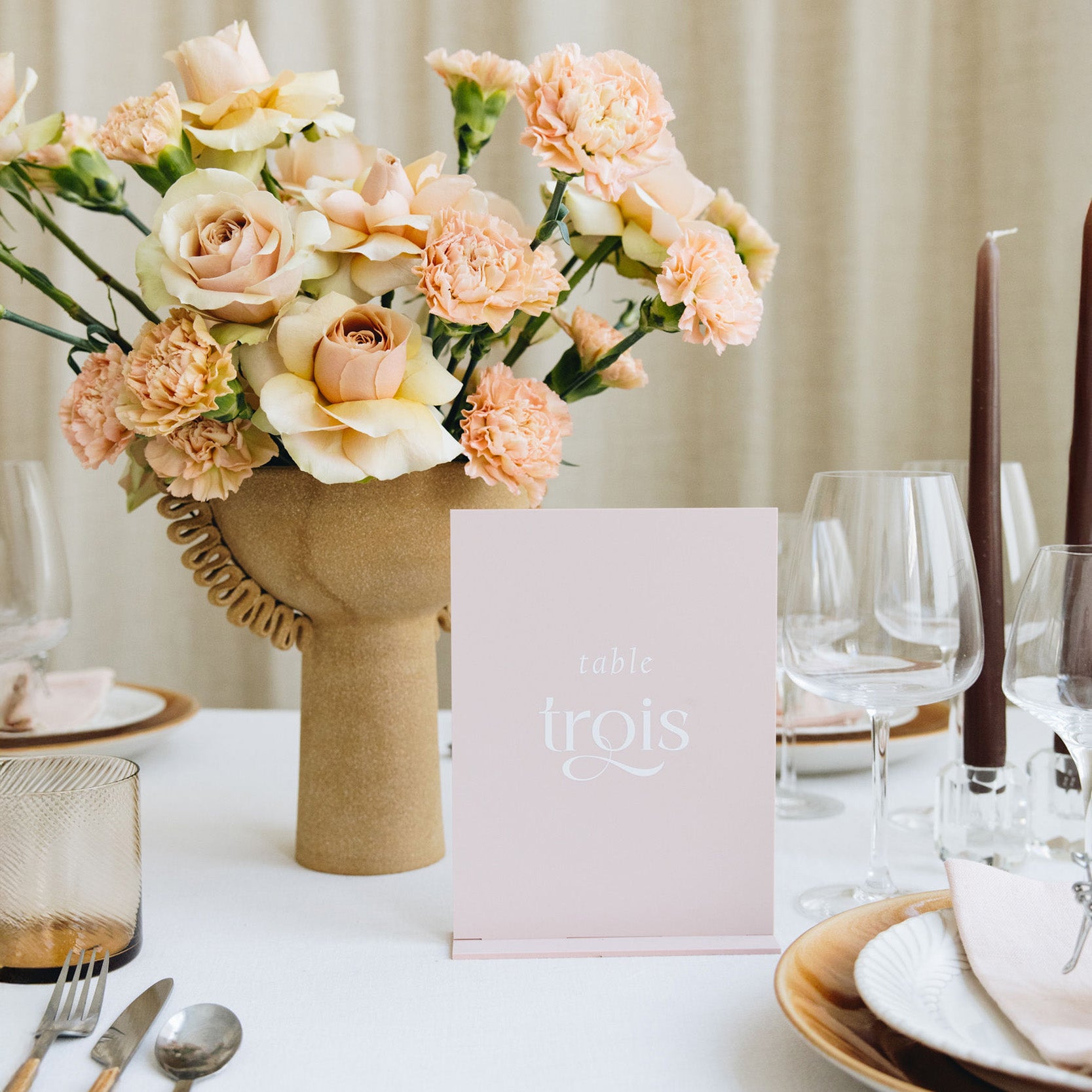 Découvrez les noms de table personnalisés de notre collection Romane, une collection moderne qui joue avec une police originale et des matériaux aux tons doux et chaleureux.