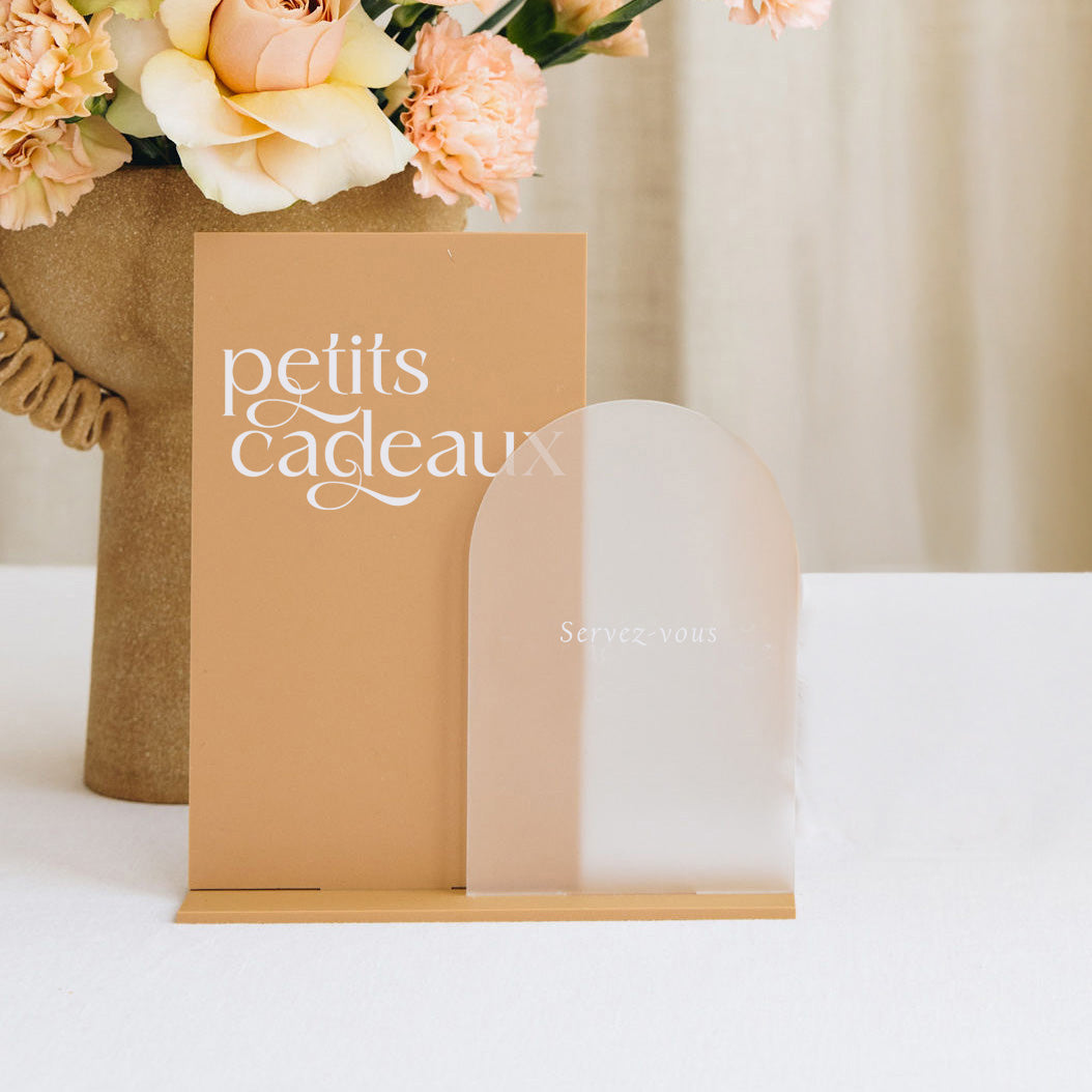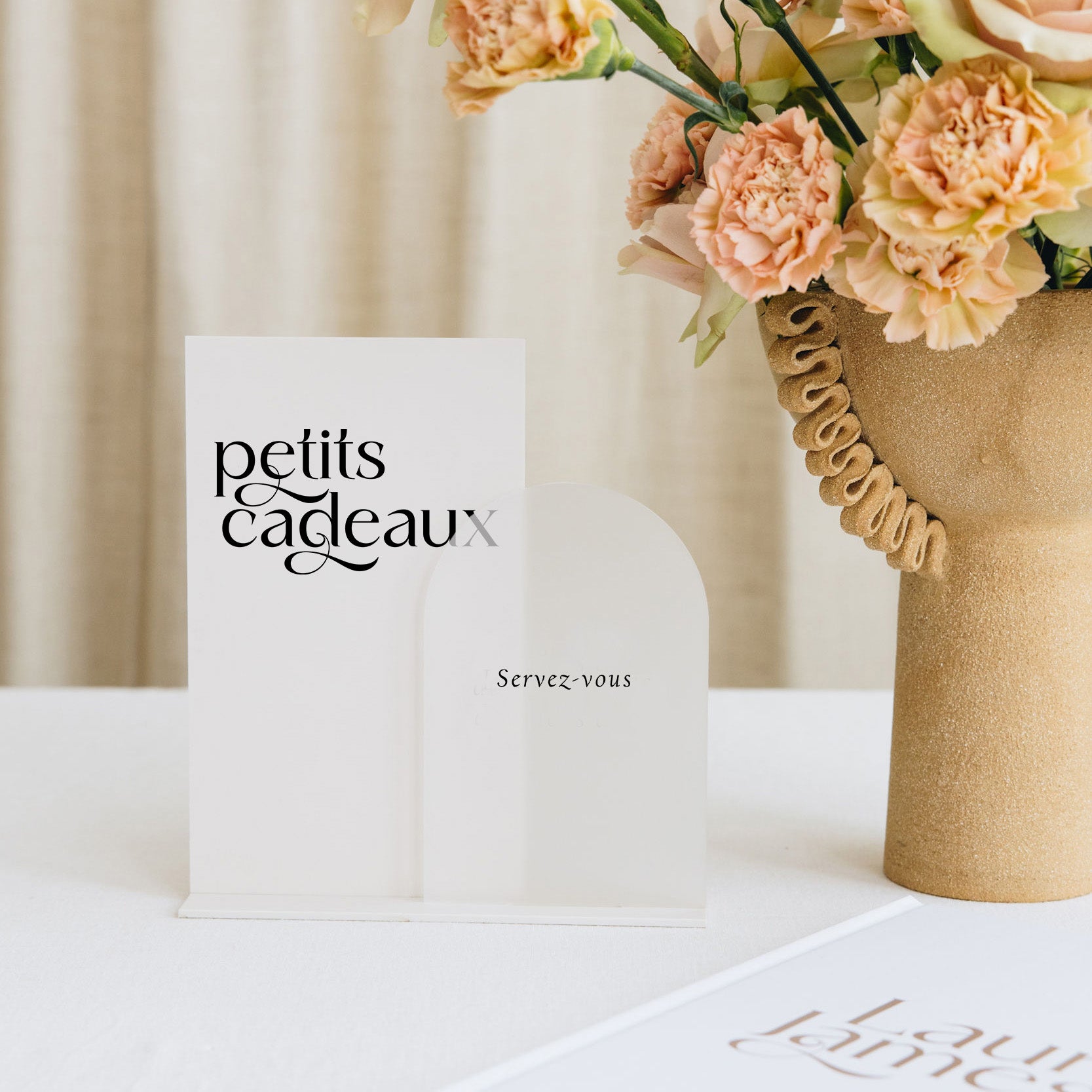 Découvrez notre panneau Cadeaux d'invités double "Romane". Imaginé par Les Mignonneries, il apportera une touche originale et élégante avec ses deux parties en le disposant près de votre urne le jour de votre mariage.