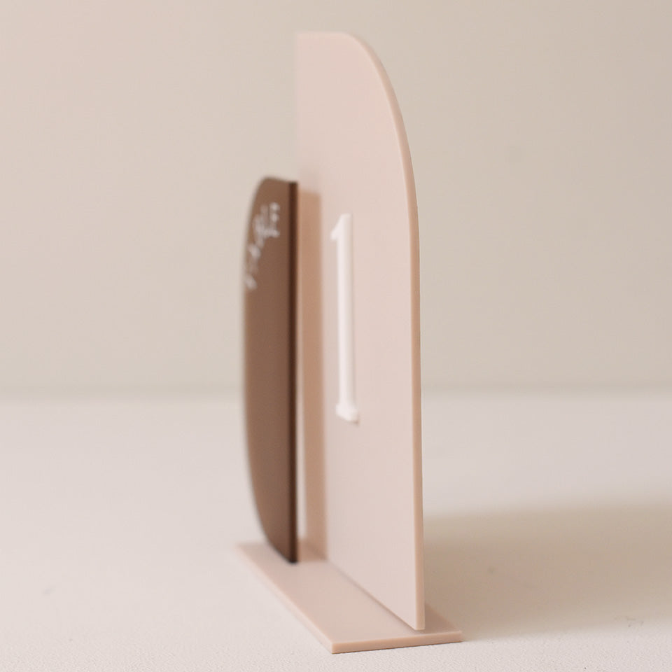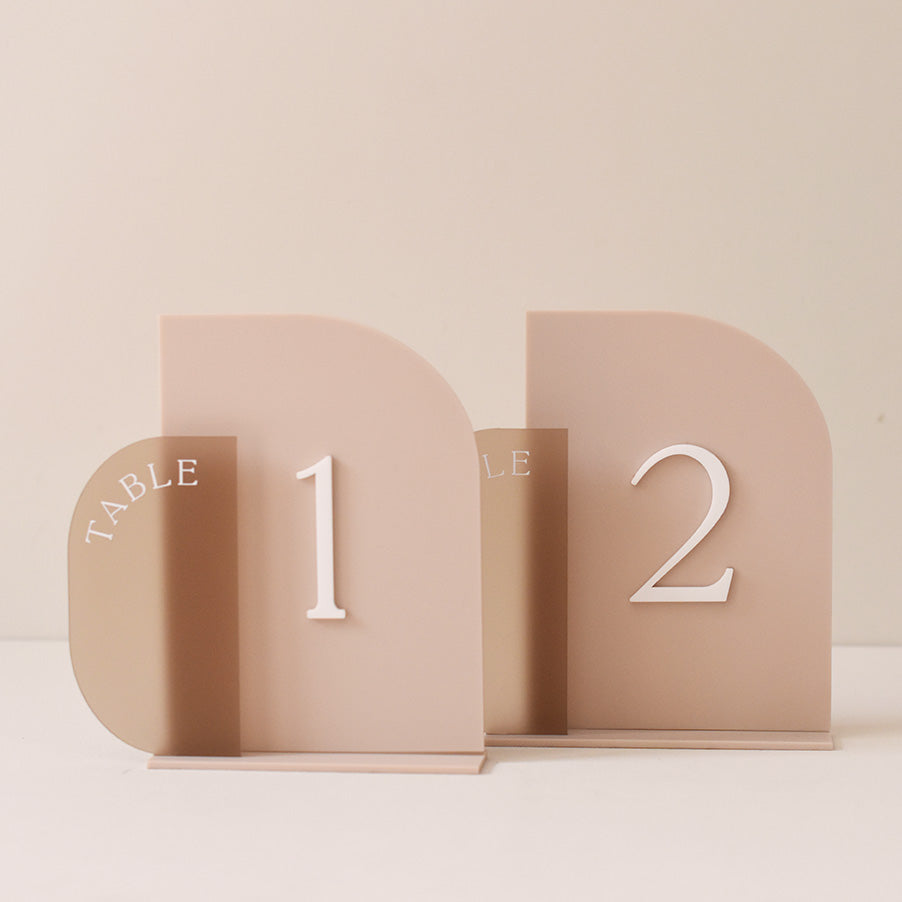 Une association de plexi mat nude et givré fumé pour que les noms de table fassent partie intégrante de votre décoration de table.