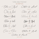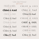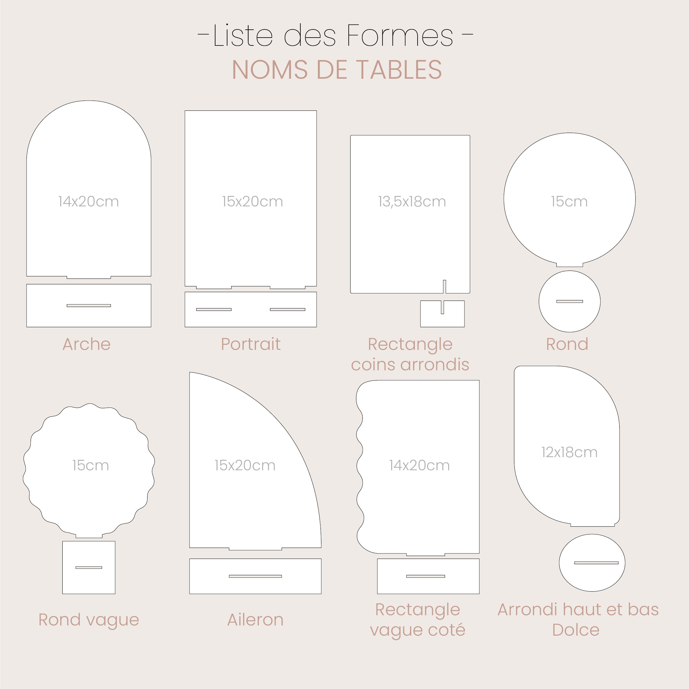 Créez vos noms de table sur-mesure chez les Mignonneries ! Découvrez nos différents matériaux et personnalisez votre visuel avec nos nombreuses polices au choix. La liste des polices n'étant pas exhaustive, n'hésitez pas à nous contacter pour discuter de la faisabilité de votre projet.