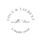 Découvrez notre joli tampon personnalisé Lola. Imaginé par Les Mignonneries et à personnaliser avec vos prénoms et la date de votre mariage, il vous permettra de personnaliser vos faire-parts ou vos petits sachets cadeaux.