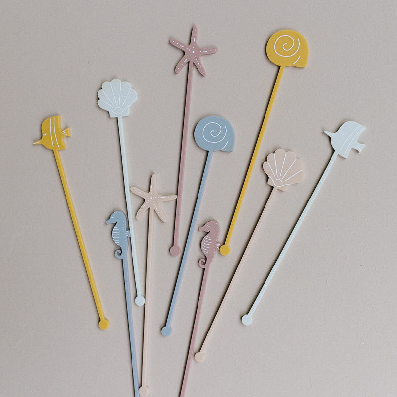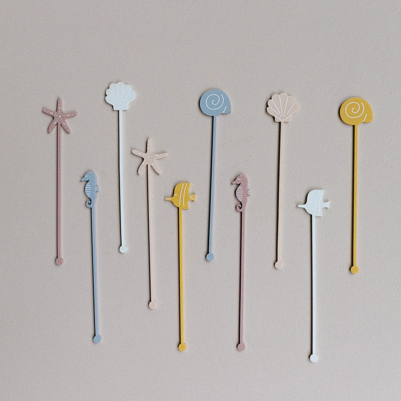 Découvrez les touillettes imprimées Océan dans un mélange varié de formes et de couleurs (étoile de mer, hippocampe, coquillage, coquillage escargot et poisson). De jolis mélangeurs imaginés par Les Mignonneries à offrir à vos petits invités. Fabriquées à partir de plexiglass mat, elles sont coupées et imprimées dans notre atelier. Vous pourrez faire votre choix parmi 5 couleurs.