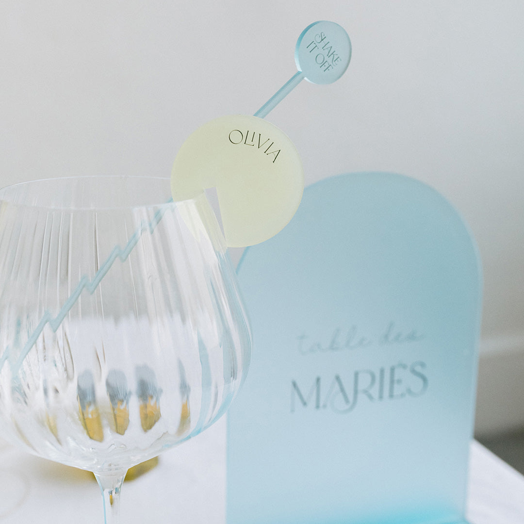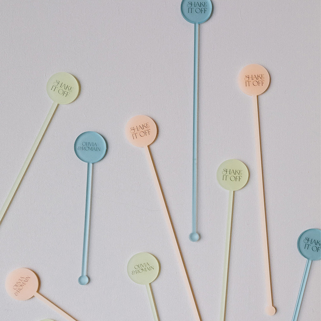 Découvrez les touillettes imprimées Pastel imaginés par Les Mignonneries à offrir à vos invités. Fabriquées à partir de plexi givré coloré, elles sont coupées et imprimées dans notre atelier. Vous pourrez sélectionner le coloris et le format souhaité dans les champs ci-dessous.