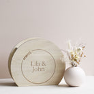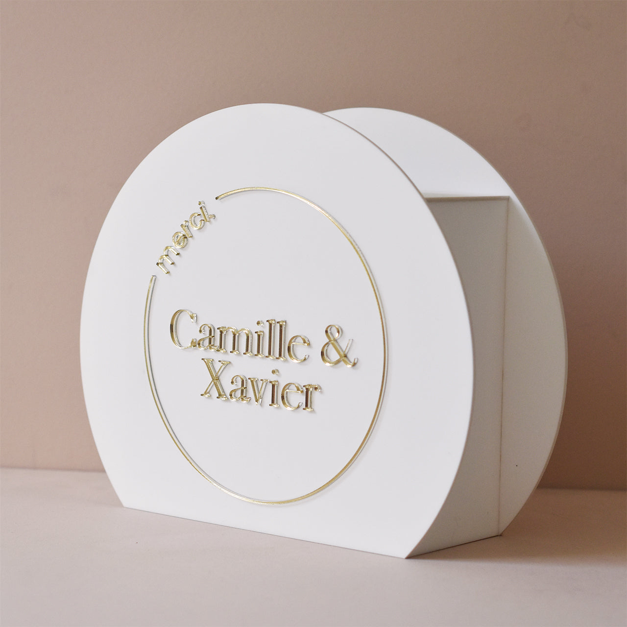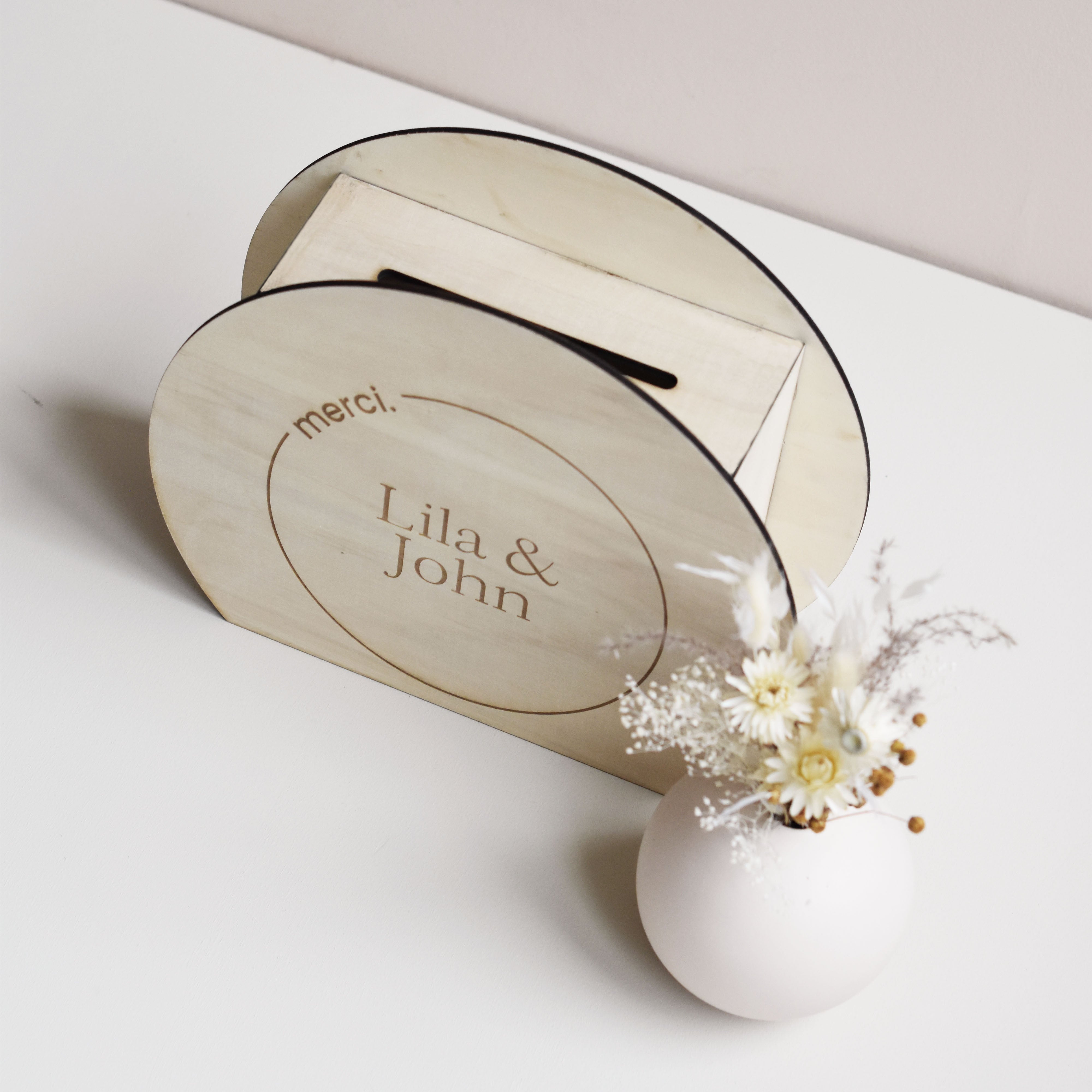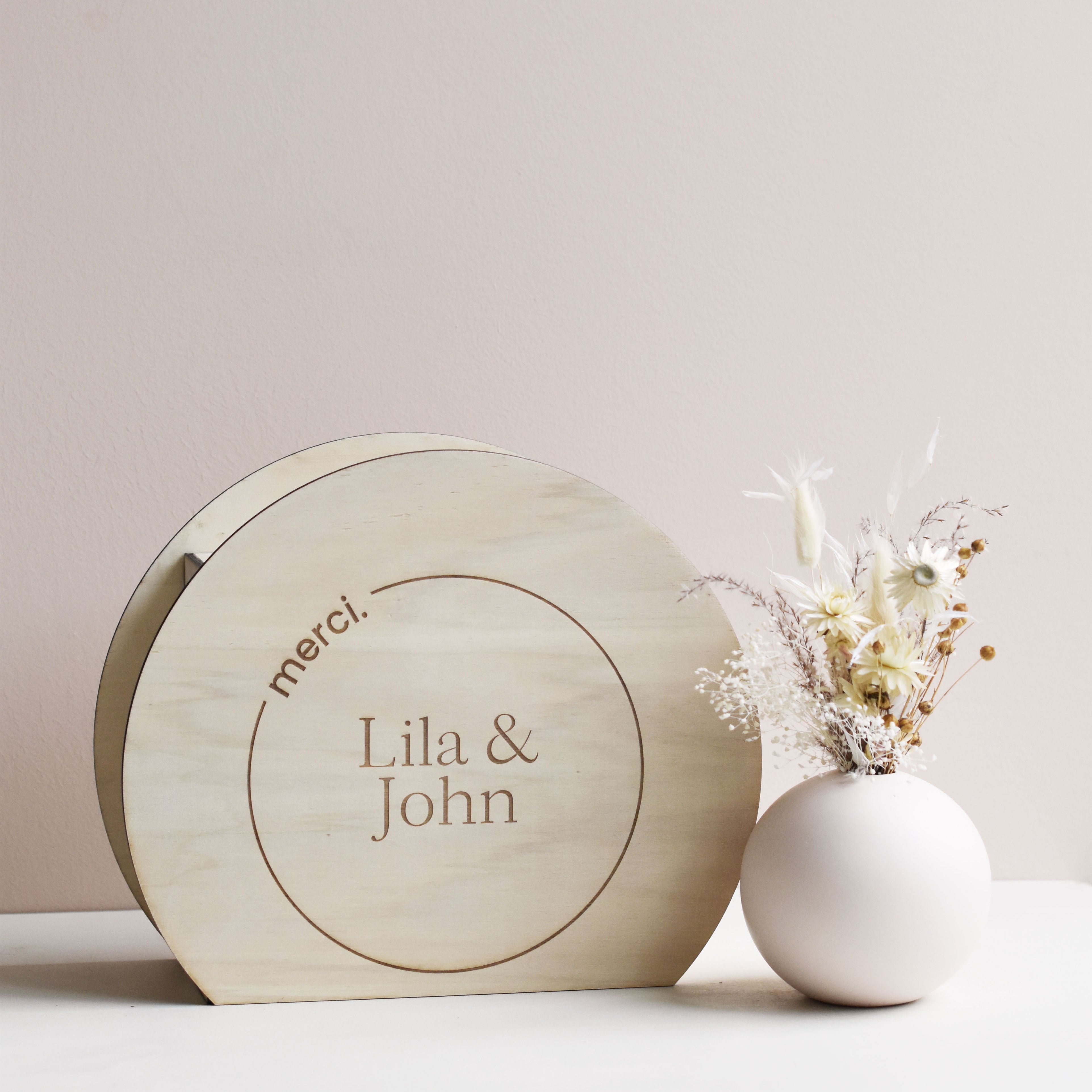 Une urne à la forme originale et arrondie pour votre mariage, un baptême ou tout autre événement imaginée par Les Mignonneries à personnaliser avec vos prénoms.
