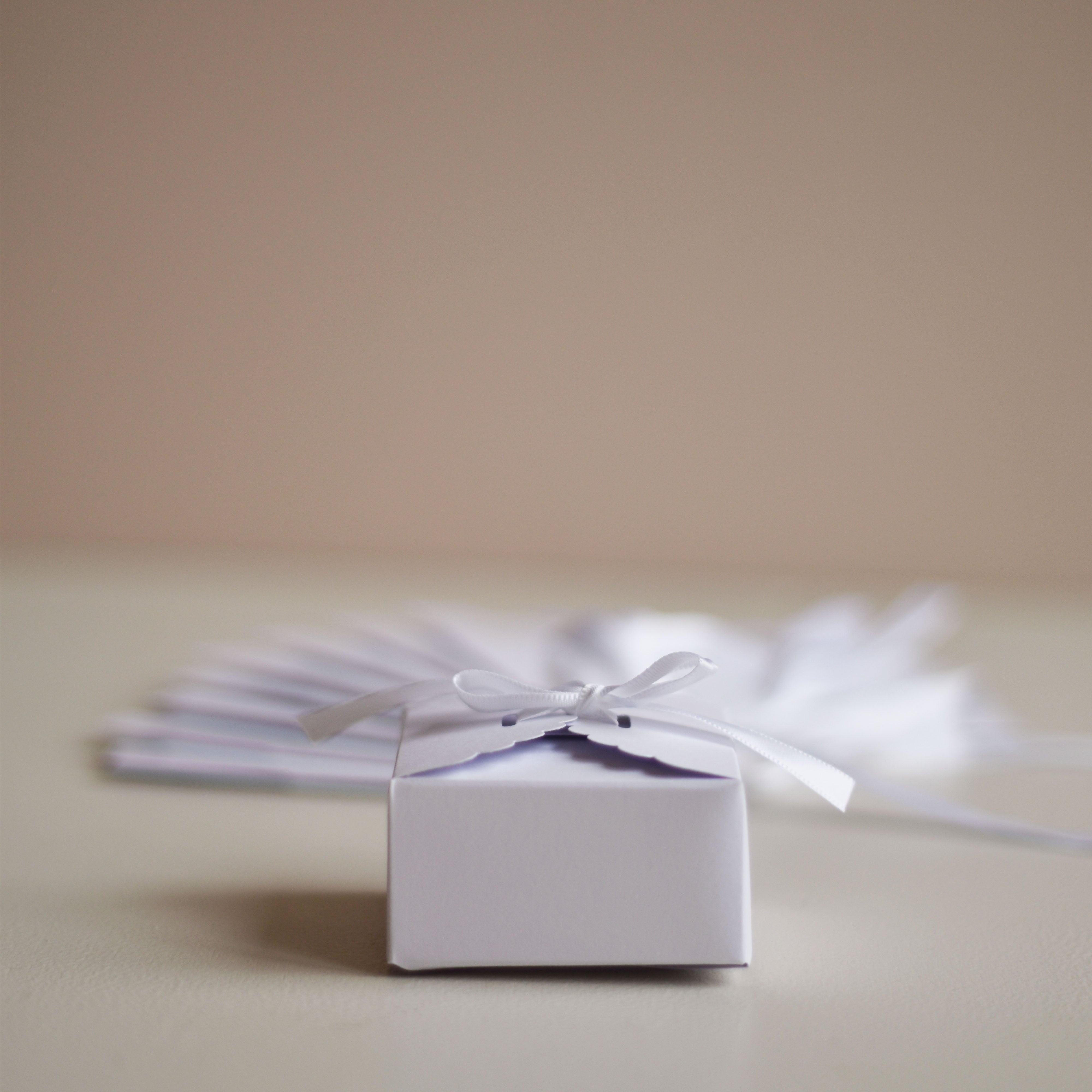 Lot de 10 petites boîtes festonnées blanches avec un ruban en satin, proposés par les Mignonneries et à personnaliser avec nos étiquettes.
