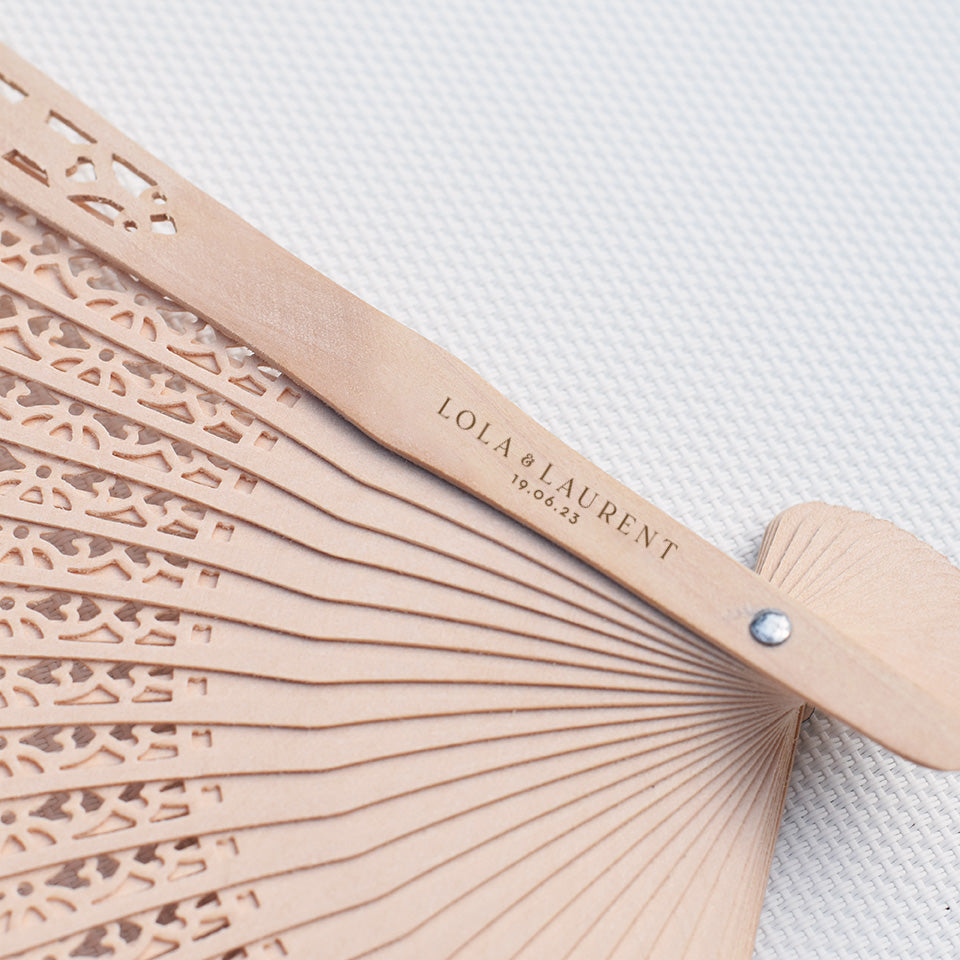 Un éventail gravé dans notre atelier de Tours et personnalisable avec le ou les prénoms, et si vous le souhaitez, la date de votre événement.