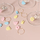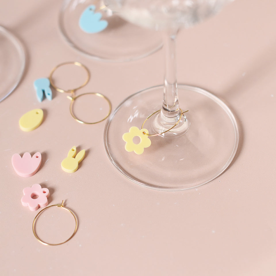 Ce lot de marque-verres associe la finesse du plexi pastel à la praticité d’un anneau en métal. Chaque petite découpe représente un symbole emblématique de Pâques et du printemps : lapin, carotte, œuf de Pâques et fleur, déclinés en trois couleurs pastel.