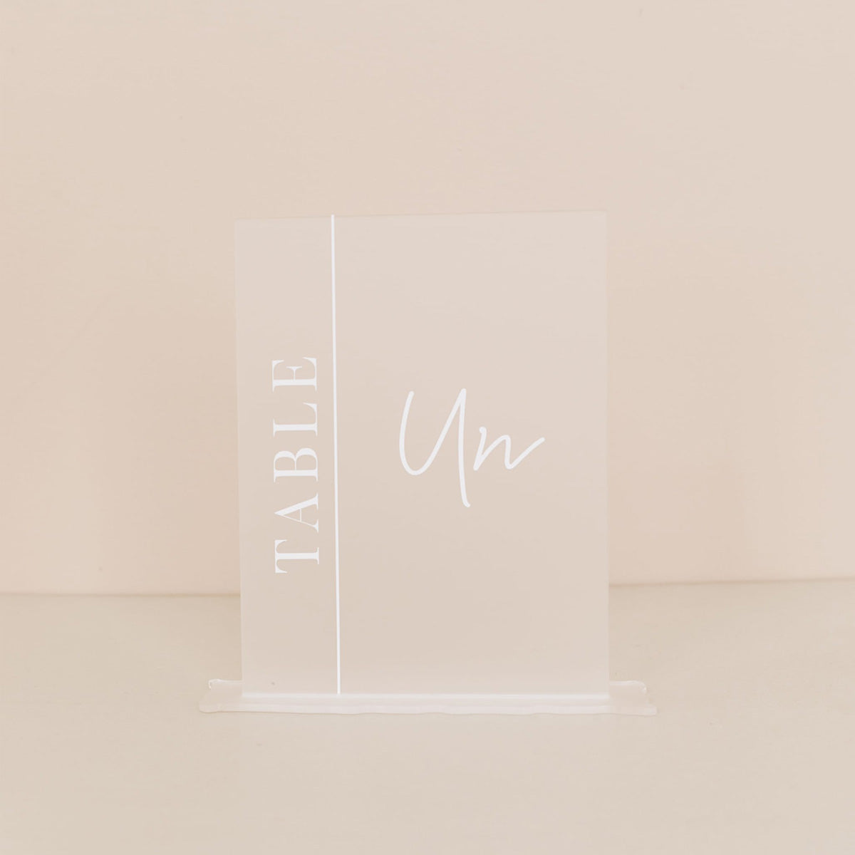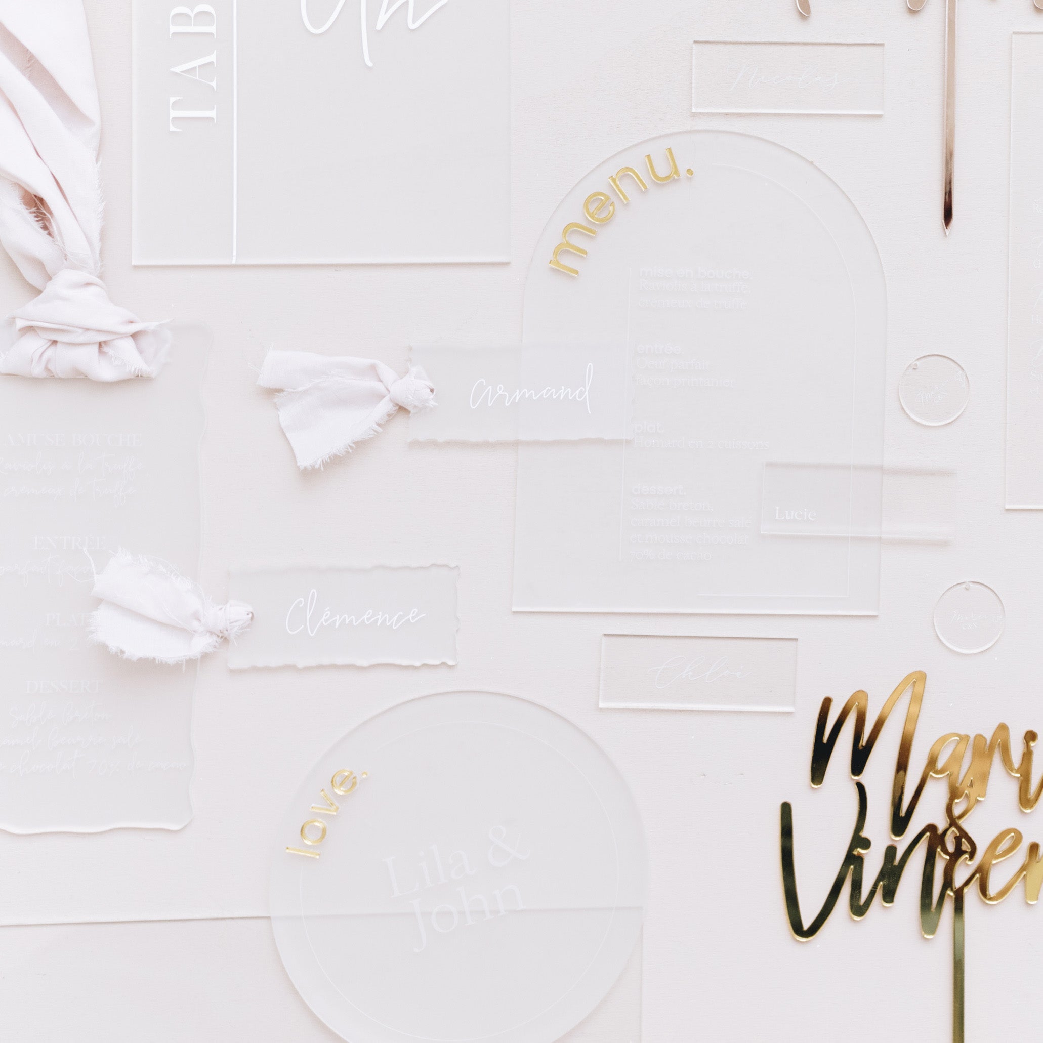 Découvrez les noms de table personnalisés en plexi givré blanc Frost. Des noms de tables imaginés par Les Mignonneries à personnaliser avec vos propres termes.